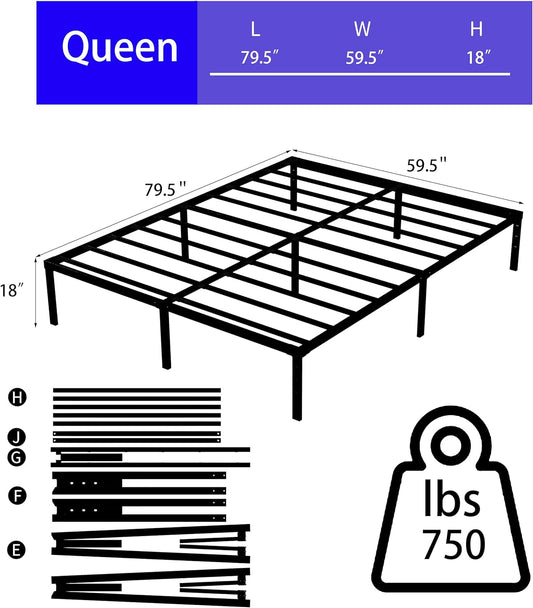 NEW - DERYONI 18 inch Queen Size Bed Frame No Box Spring Needed Heavy Duty Queen Platform Bed Frame Steel Slat Support 750lbs High Easy Assembly Noise Free Black Bed Frame Queen Size - Retail $76