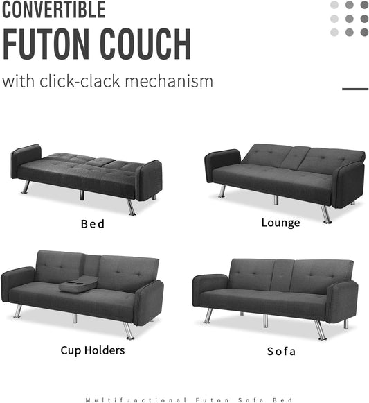 NEW - IULULU Futon Sofa Bed, Convertible Couch with 2 Cup Holders Loveseat with Armrest for Studio, Apartment, Office, Living Room, Dark Grey - Retail $266