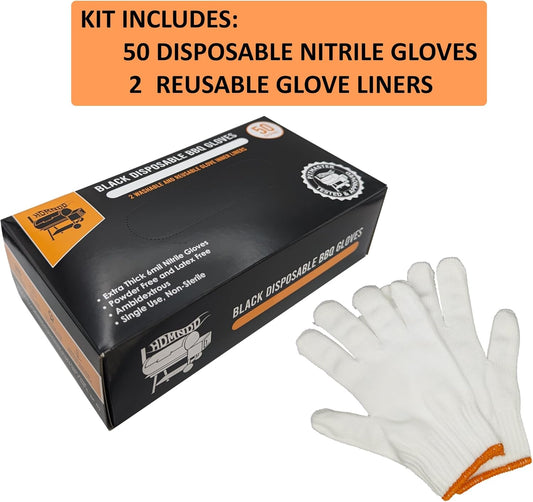 Black Disposable BBQ Grill Gloves Kit - 50 Heavy Duty Textured Grip and 2 Heat Resistant Reusable Liners Meat Pulling