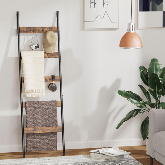 Blanket Ladder, 5-Tier Towel Holder with 4 Removable Hooks, Farmhouse Wall Leaning Decorative Rack Shelf, Wooden Towel Display Rack, Quilt Ladder for Living Room, Bedroom, Rustic Brown