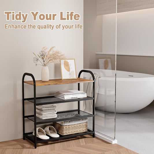 NEW w/ dmg - 4-Tier Shoe Rack with Large Capacity, Metal Shoe Shelf Organizer, Free Standing Shoe Rack for Front Door Entrance Entryway Hallway Living Room Doorway (11.02"D x 24.41"W x 23.62"H, Rustic)