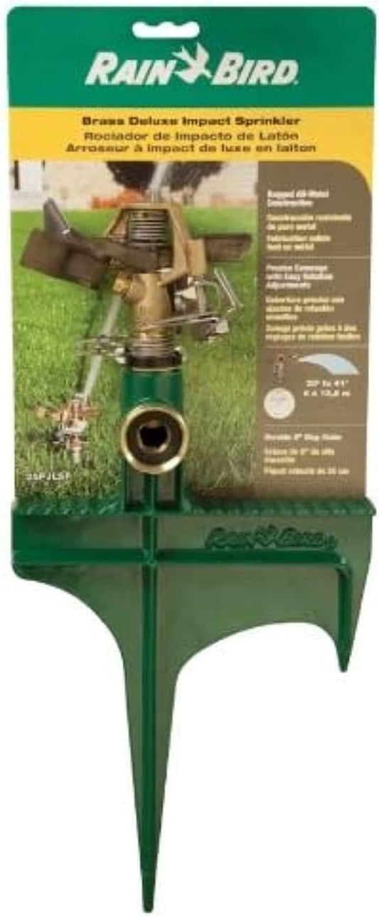 Rain Bird 25PJLSP Hose-End Brass Impact Sprinkler on Large Spike, Adjustable 20° - 360° Pattern, 20' - 41' Spray Distance , Green - Retail $30