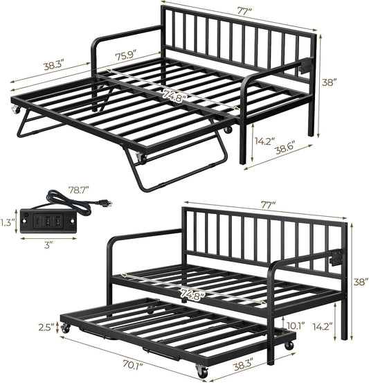Rolanstar Daybed with Charging Station and LED Lights, Height Adjustable Twin Daybed with Trundle, Metal Sofa Bed Frame with Steel Slat Support for Living Room, Bedroom and Guest Room, Black