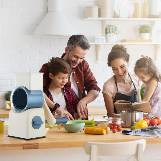 rotary cheese grater slicer with handle and suction base, stainless steel mandoline slicer with large barrel, vegetable potato slicer, nut grinder, carrot shredder, chopper, cutter