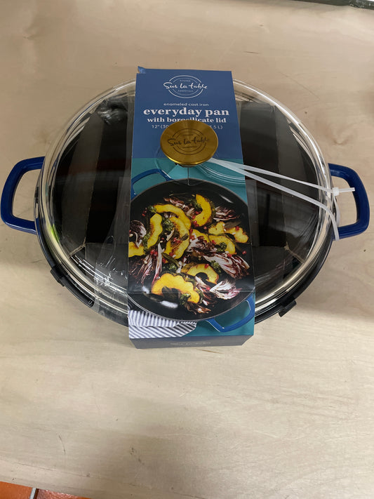 Sur La Table Kitchen Essentials 3.75 Quart Enamel Cast Iron All In One Multi-Purpose Non-Toxic Nonstick Braiser Pan W/Borosilicate Glass Lid - Blue - Retail $60