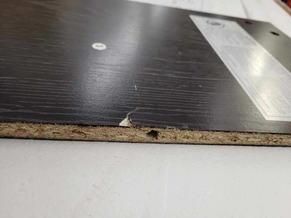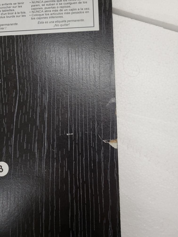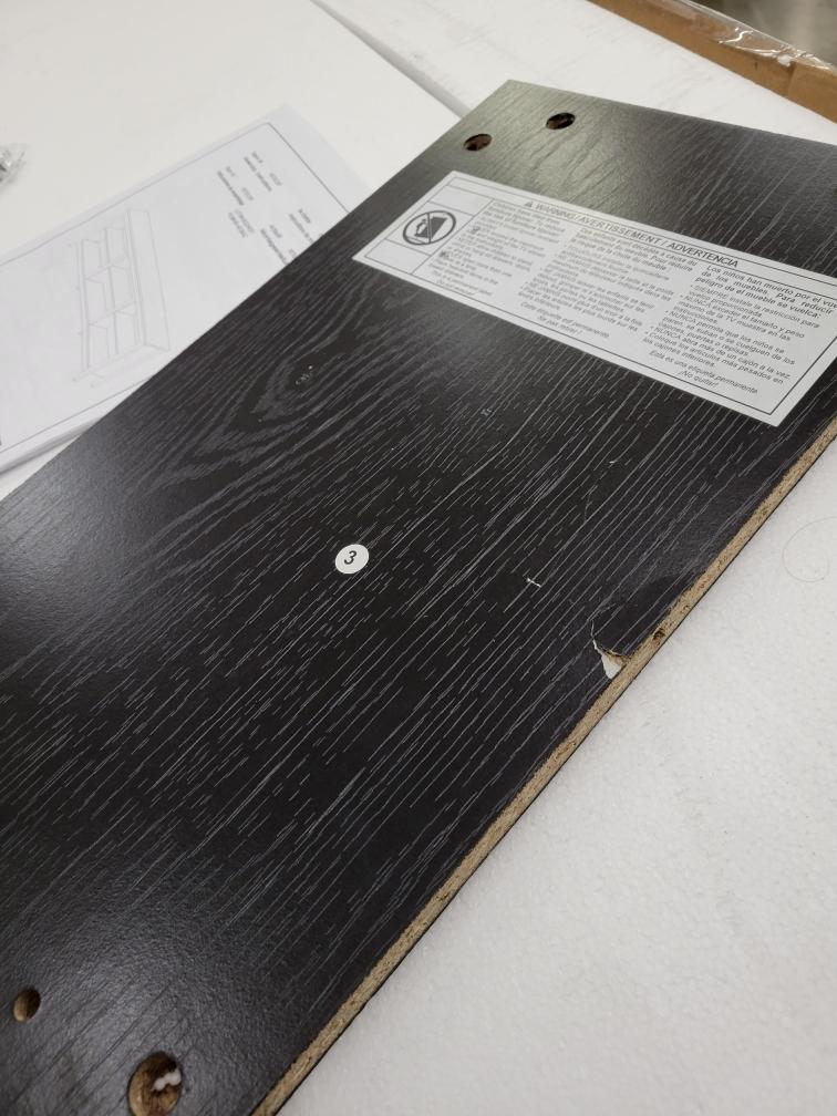 slightly damaged (slight splitting) on one of the shelves (near wood peg hole on edge)