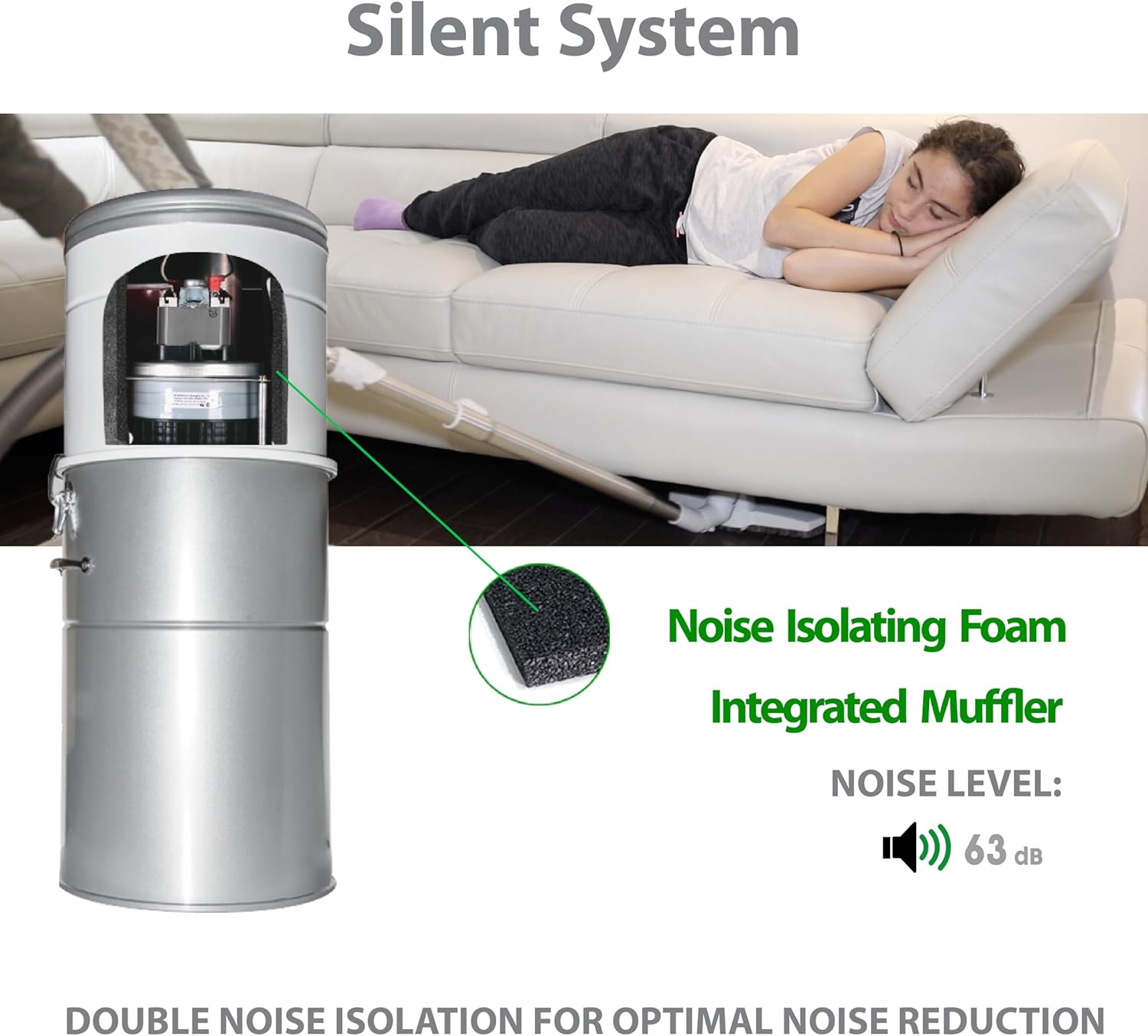 OVO Unit Heavy Duty Powerful Central Vacuum System, Hybrid Filtration (with or Without Disposable Bags) 35L or 9.25Gal, 700 Air watts with 40 ft Carpet Deluxe Accessory Kit, Silver