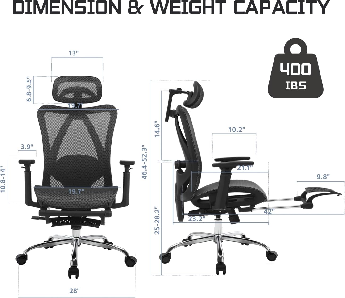 - 【Safety Guarantee】The gas lift cylinder of the ergonomic office chair has obtained certifications from SGS and TUV, and has successfully passed the BIFMA durability test, ensuring the safety of the height adjustment feature. Furthermore, the chair's metal base is capable of effortlessly supporting a weight of up to 400 pounds.
