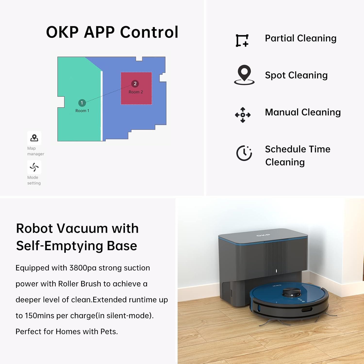 NEW - OKP L3 Robot Vacuum with Self-Empty Base, 90-Day Capacity, 200mins Runtime, Lidar Navigation, Home Mapping, Schedule, WiFi/App/Alexa, Robotic Vacuum Cleaner for Pet, Hard Floors, Carpet