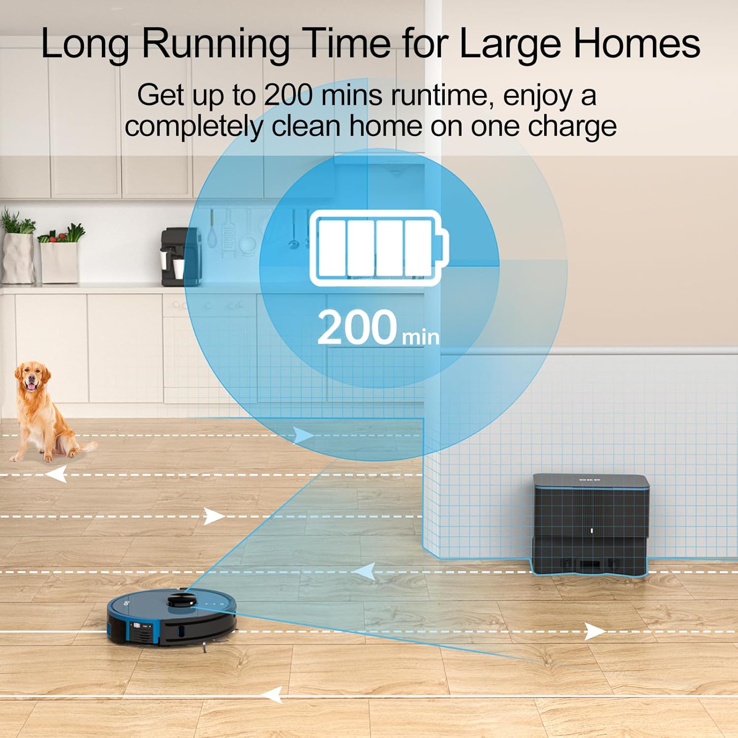 - 【200-Minute Runtime for Extended Cleaning Power】With an impressive 200-minute runtime, the OKP L3 can clean large homes up to 2400 sqft on a single charge. When the battery runs low, it automatically returns to its charging station and resumes cleaning right where it left off.