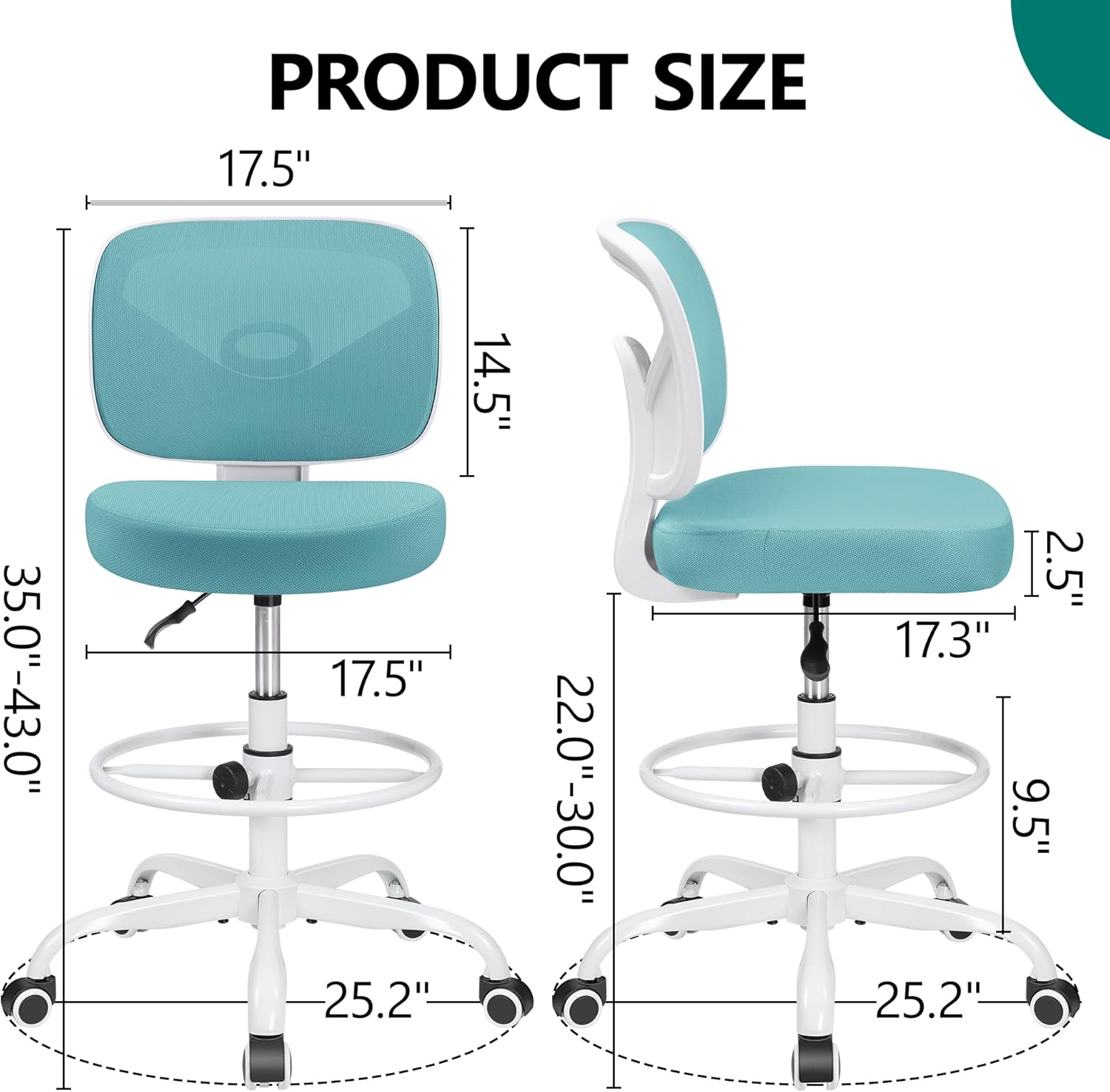 Primy Office Drafting Chair Armless, Tall Office Desk Chair Adjustable Height and Footring, Low-Back Ergonomic Standing Desk Chair Mesh Rolling Tall Chair for Art Room, Office or Home(Teal)