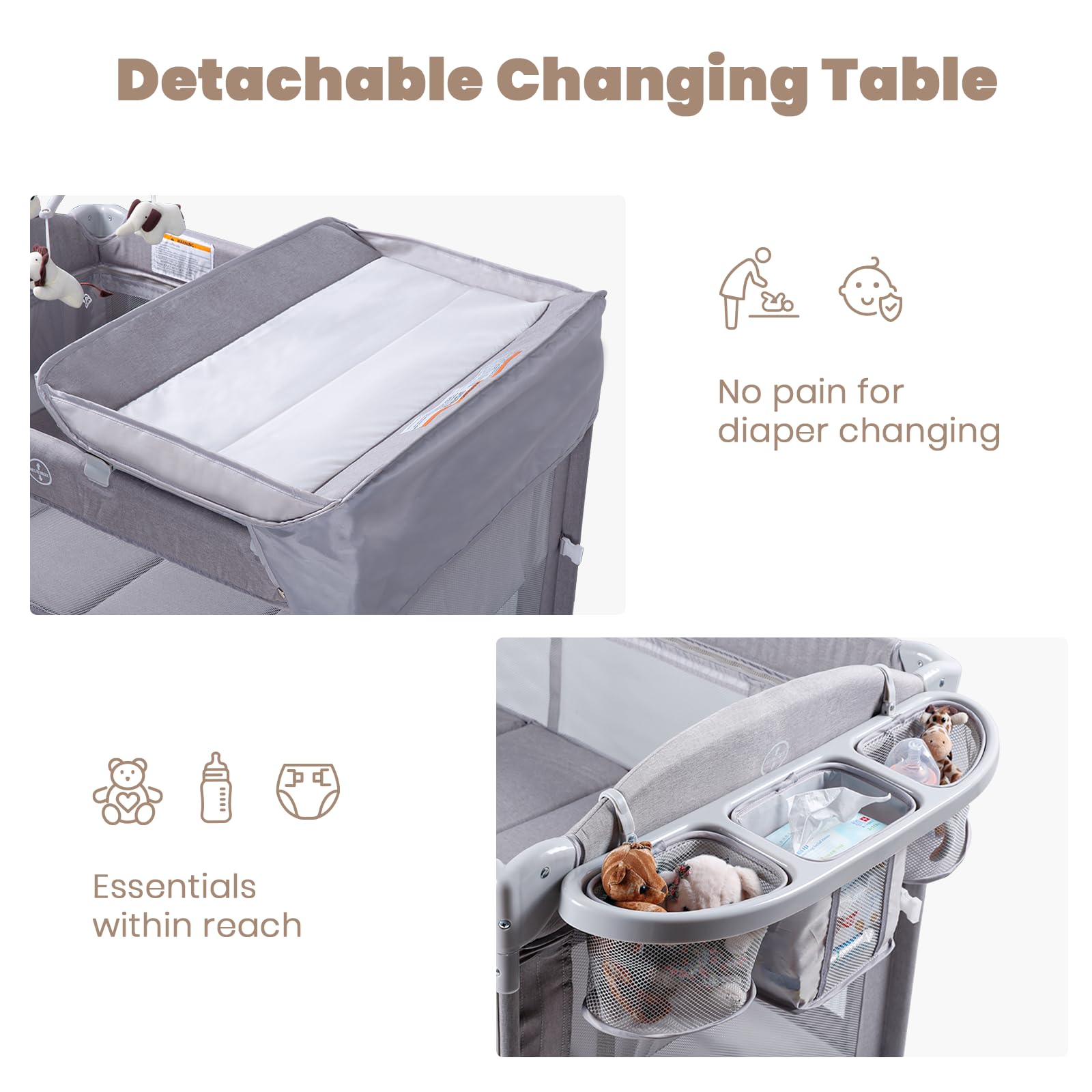 Baby Bassinets Bedside Sleeper, 4 in 1 Portable Bedside Crib w/Mattress, Diaper Changer, Storage Basket, Music Box, Carry Bag, Foldable Playard Sleeper for Newborn (Light Gray)
