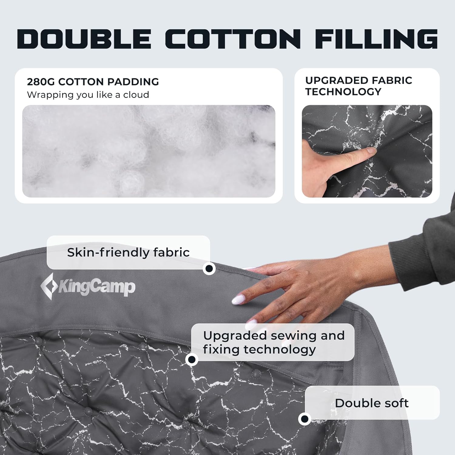 - 🥂PADDED CHAIR:The double camping chair is composed of double-layer cotton, filled with 280 grams of cotton, soft and comfortable, the chair surface is made of 600D Oxford, which brings you and your family a wonderful outdoor time.