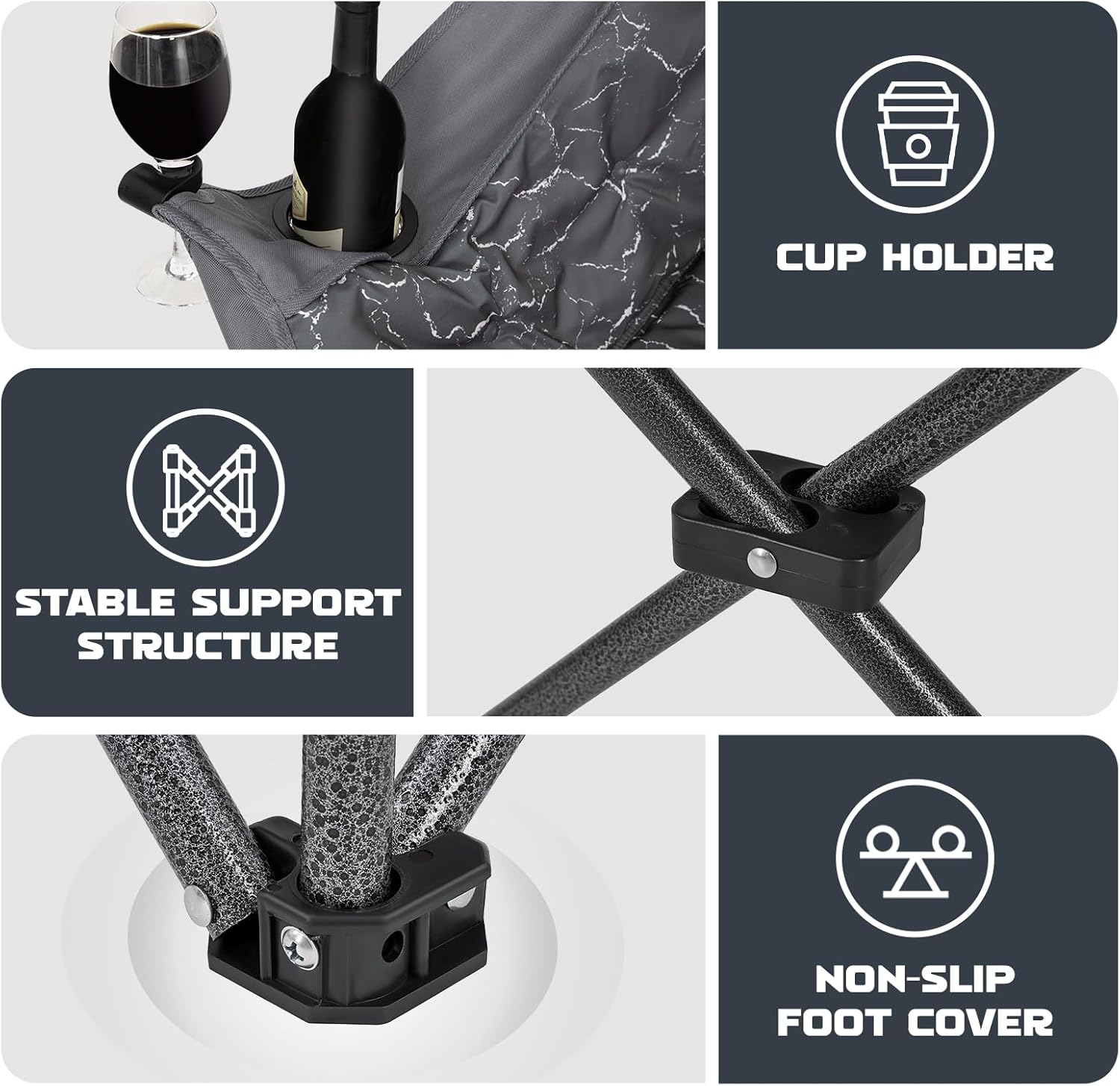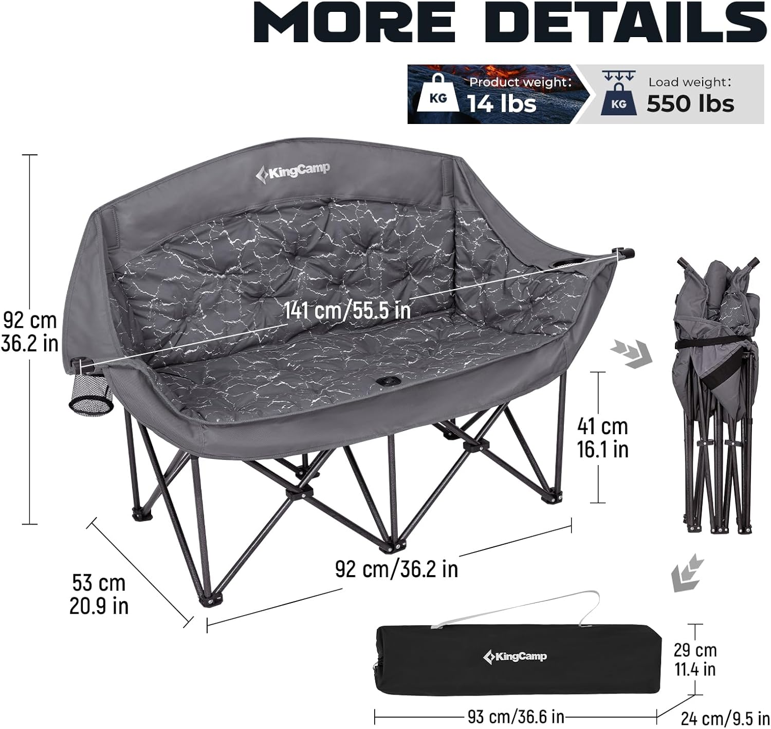 - 🥂OVERSIZED HEAVY DUTY: This oversized camping chair so there's plenty of room for 2 person. The loveseat camping chair is made of 600D oxford fabric and durable Q195 steel frame construction, Supports 550 lbs. Great for couples!This camping chair for adults can fulfill many of your needs!