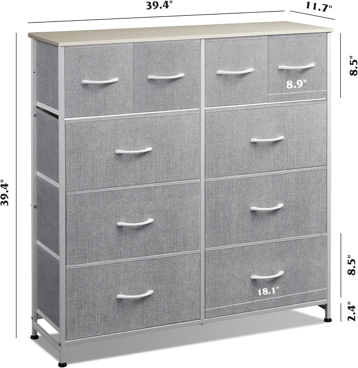 WLIVE Fabric Dresser for Bedroom, Dresser with 10 Drawers, Storage Tower with Fabric Bins, Double Dressers, Chest of Drawers for Closet, Living Room, Hallway, Light Grey - Retail $80