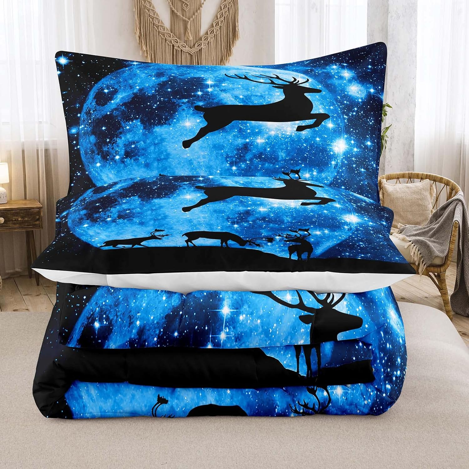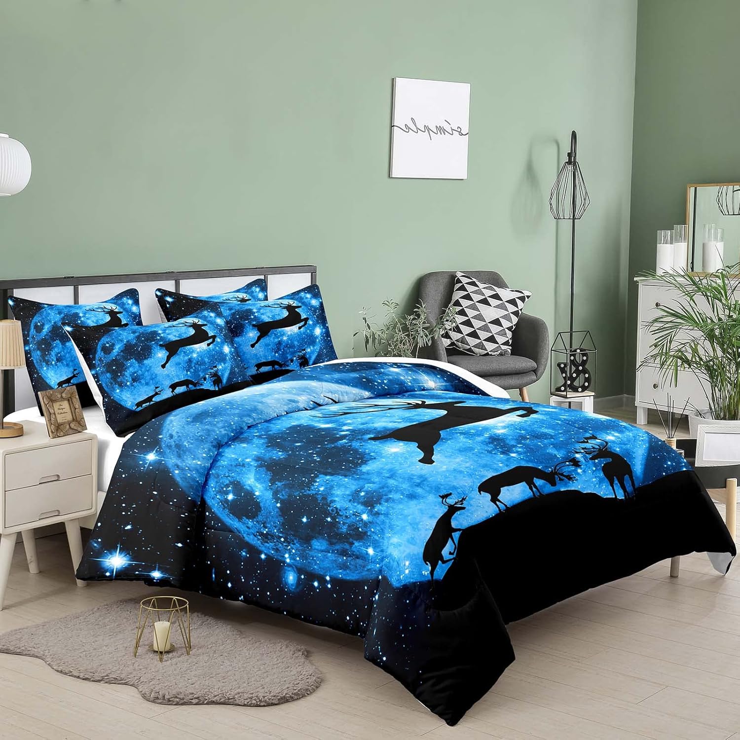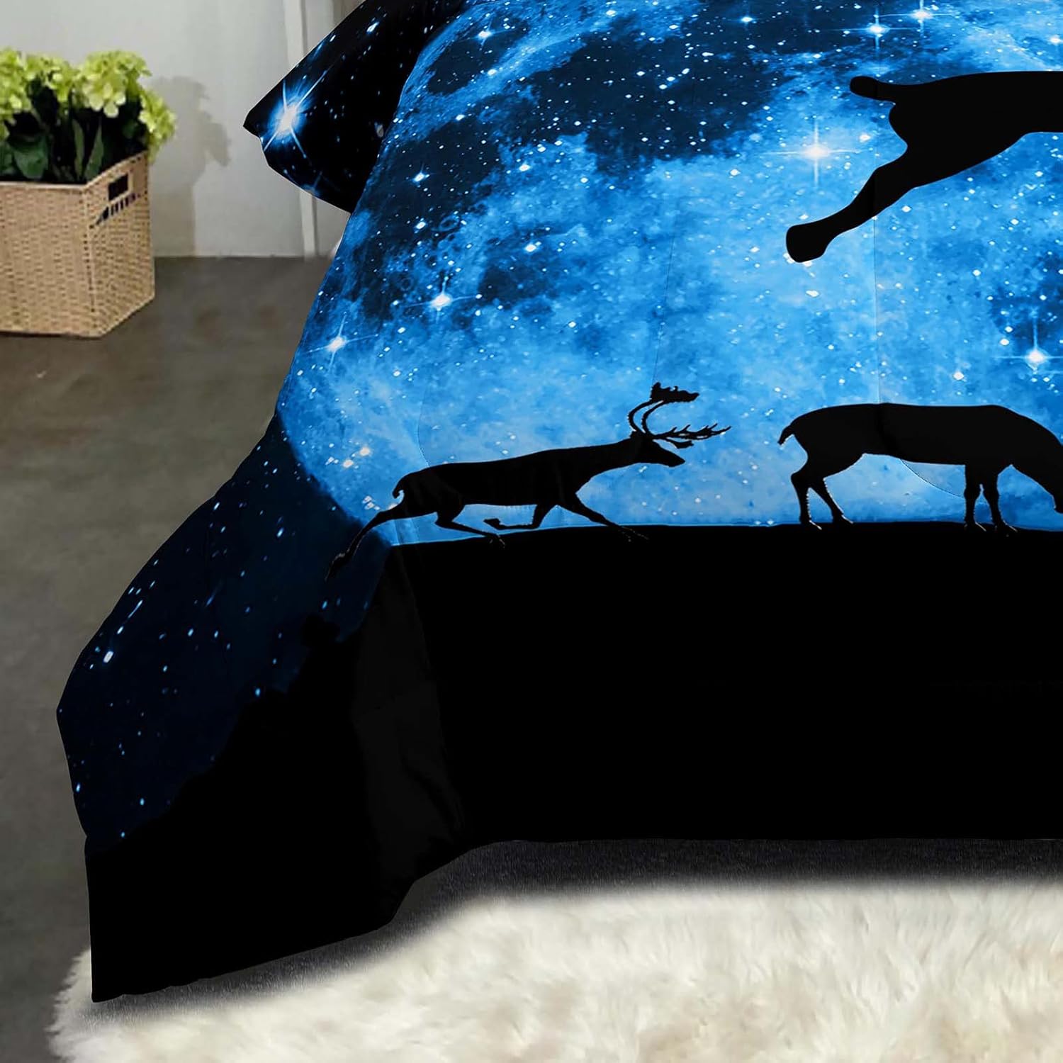 NEW - NINENINE QUEEN Galaxy Deer Comforter, Blue Moonlight Bedding Sets,Outer Space Bedding Set with 1 Comforter 2 Pillowcases