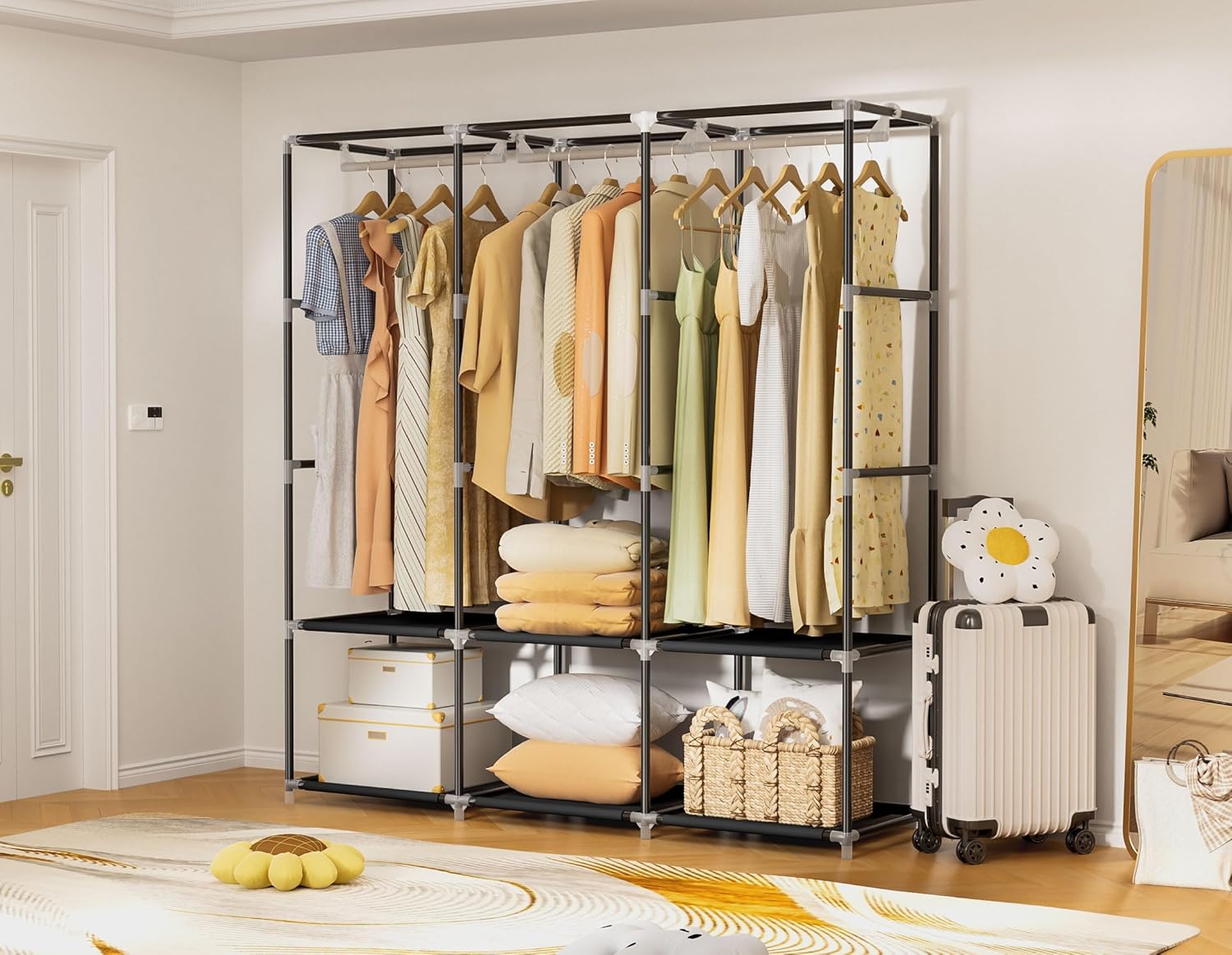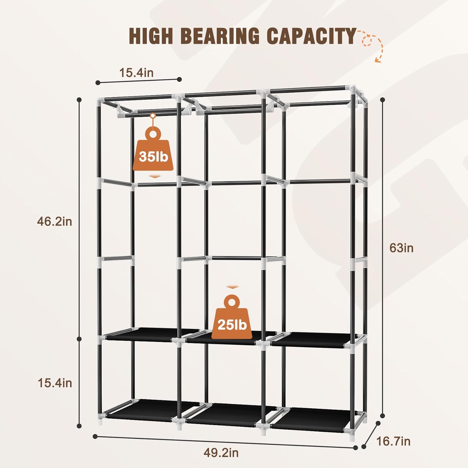 Wardrobe Closet,Portable Closets for Hanging Clothes,Free Standing Clothes Rack with Cover & 3 Hanging rods & 6 Storage Shelves & 2 Side Pockets