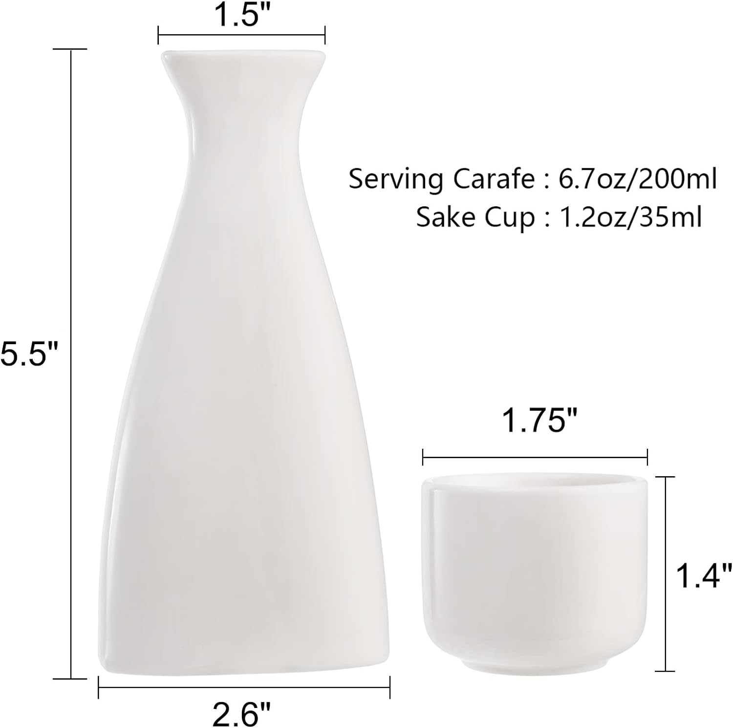 - Package includes 1 serving carafe and 6 cups. Carafe Capacity: 6.7 fl oz/200 ml; Cup Capacity: 1.2 fl oz/35 ml. Color: White