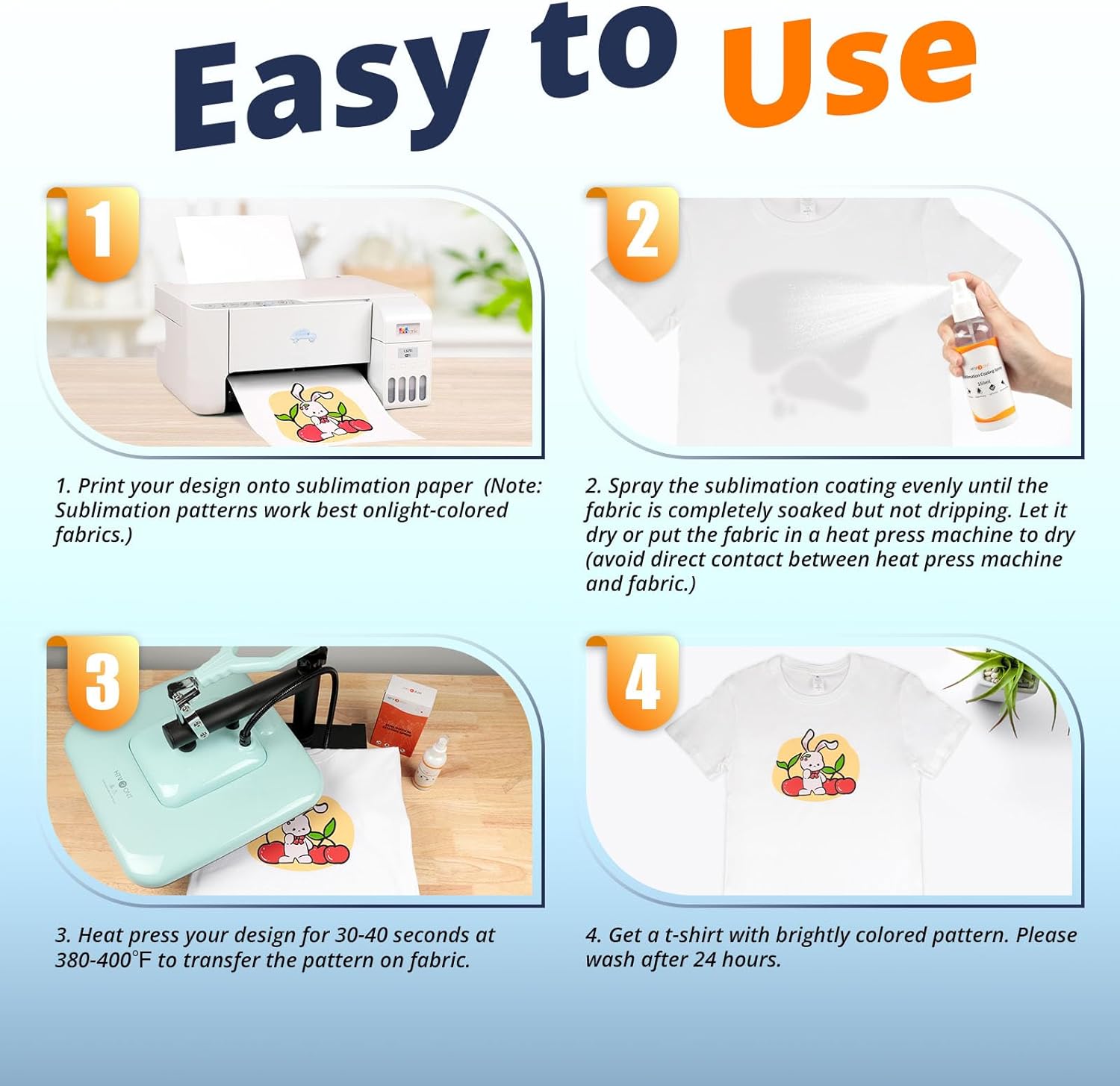 - [Vivid Color & Strong Adhesion] Compared with the 1st generation HTVRONT sublimation coating spray, the 2024 upgraded version has stronger adhesion to firmly bond your designs to the surface, ensuring they remain bright and durable. Sublimation spray works wonders by enhancing the brightness and vitality of your designs, ensuring your prints present amazing colors (Note: Wash after 24H of use, works best on light-colored fabrics)