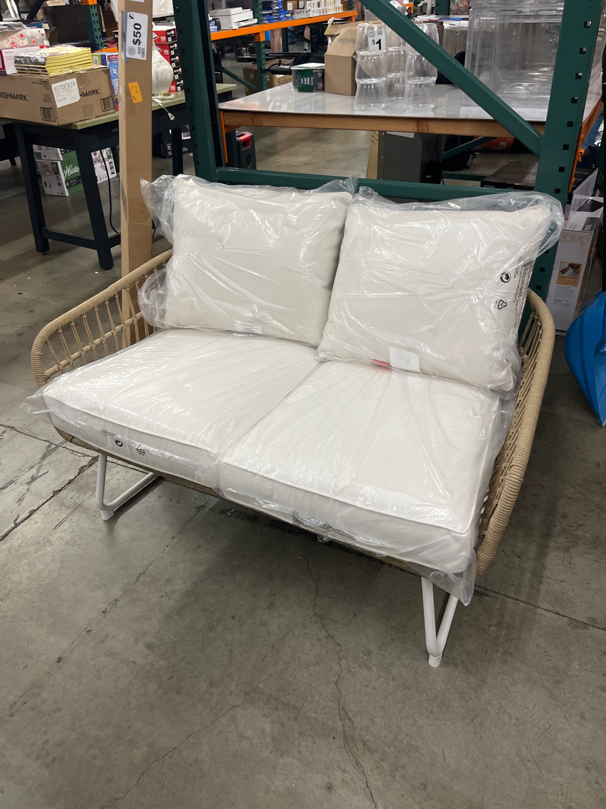 Relax on the patio with a good book, movie or chat with a friend with the Southport Patio Loveseat from Threshold™. This charming loveseat features a white steel frame paired with beige wicker details for a look that's equal parts chic and bold. The neutral colors match well with any design aesthetic you may have going on in your patio space, whether you prefer more rustic and cozy decor or an aesthetic that feels cool and streamlined. The rust- and weather-resistant properties mean worry-free maintenance and the seat and back cushions provide comfort and coziness.