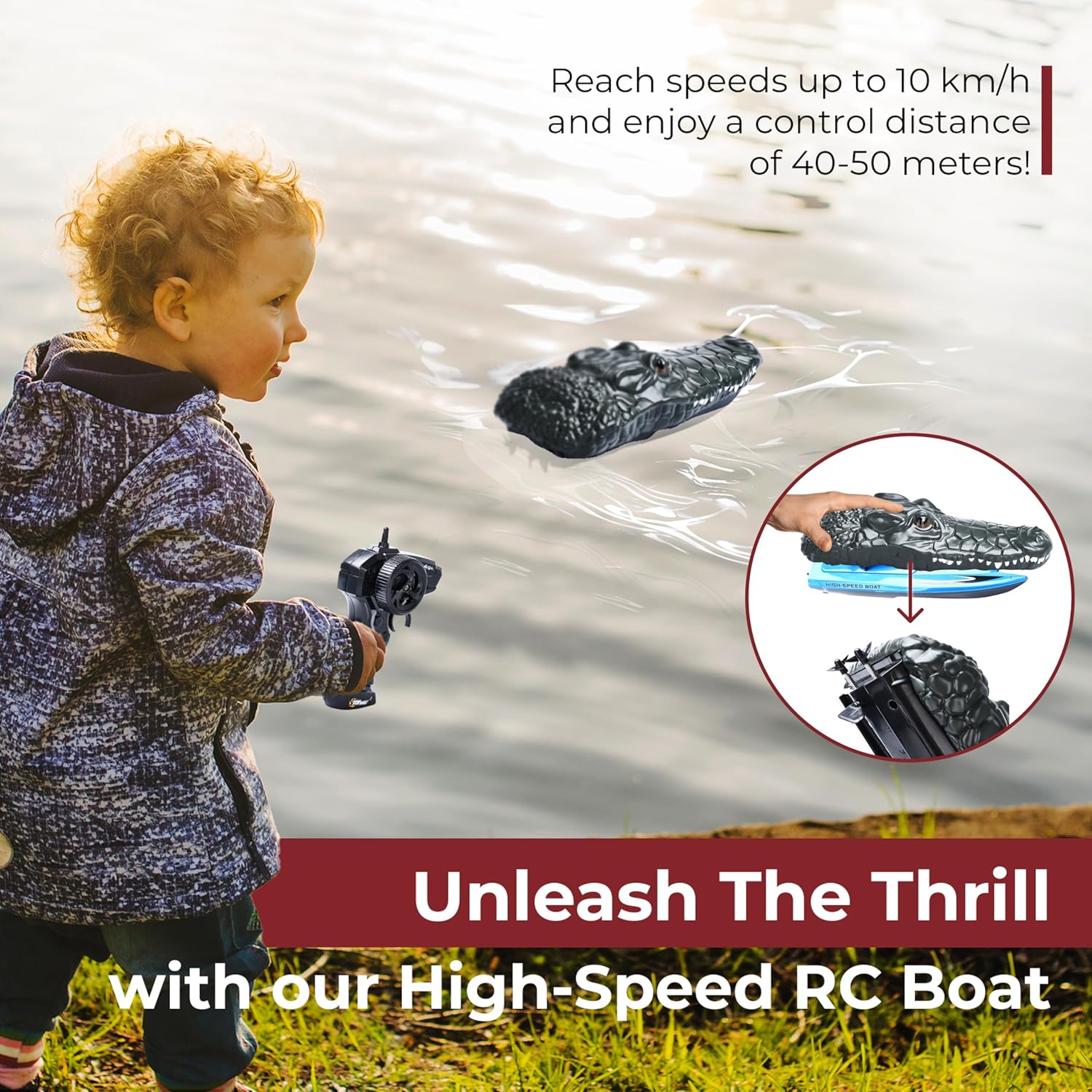 - ADVANCED FEATURES: This alligator boat, also known as an alligator remote control, is a remote control speed boat with a 2.4G waterproof remote for seamless maneuvering. It's a remote alligator head with a quick 90-minute Li-ion battery charging, 20 minutes of endurance, and 12-15KM/h speed for thrilling water races
