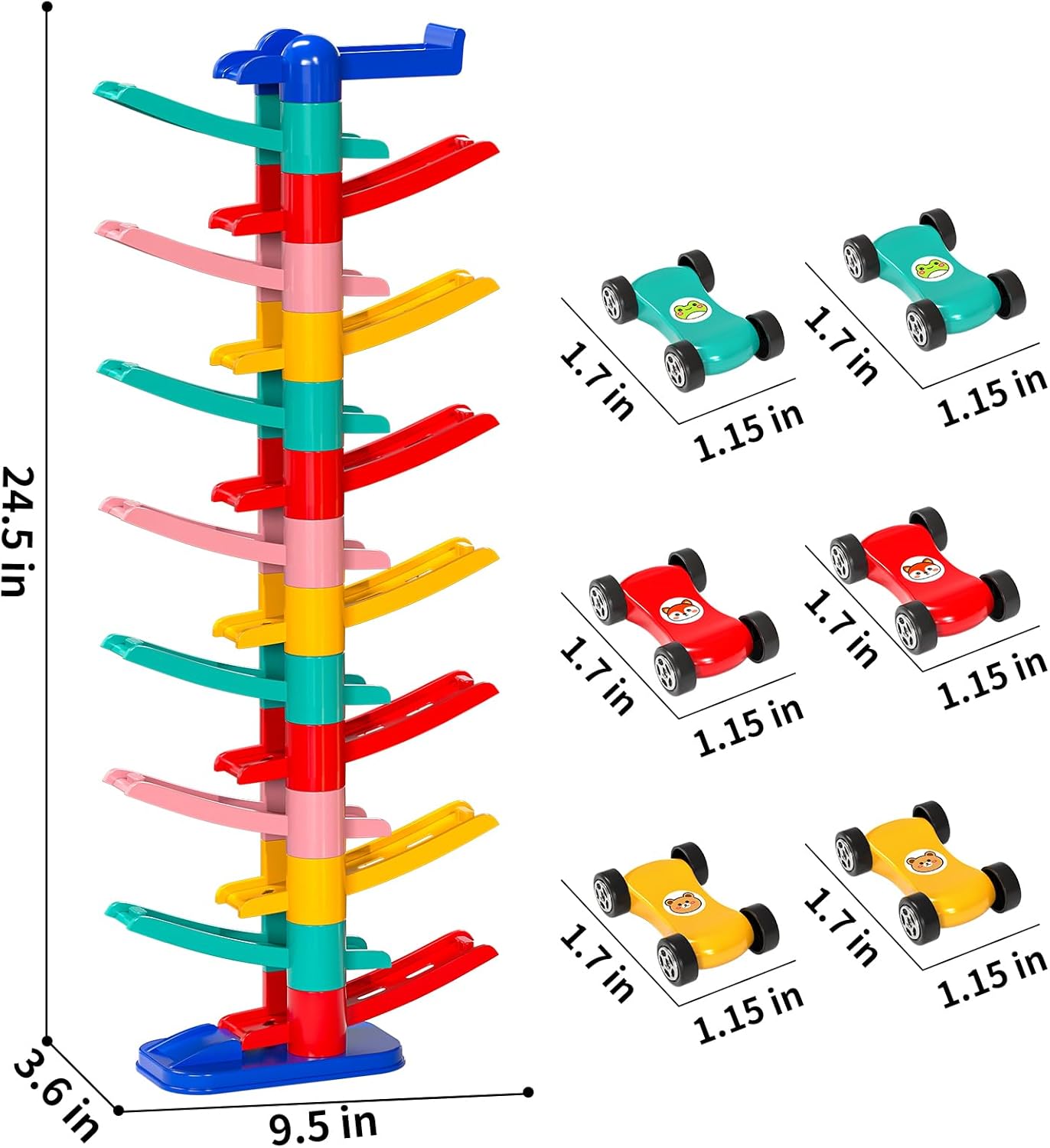 - Car Ramp Toy for kids ages 2-4: The car toy set(9.5x3.6x24.5in) includes 14 ramps(red, yellow, green and pink), 2 top parking lots, 2 basal plates and 6 small cars with cute animal sticker. A little like roller coaster car toys for toddlers 1-3 and babies