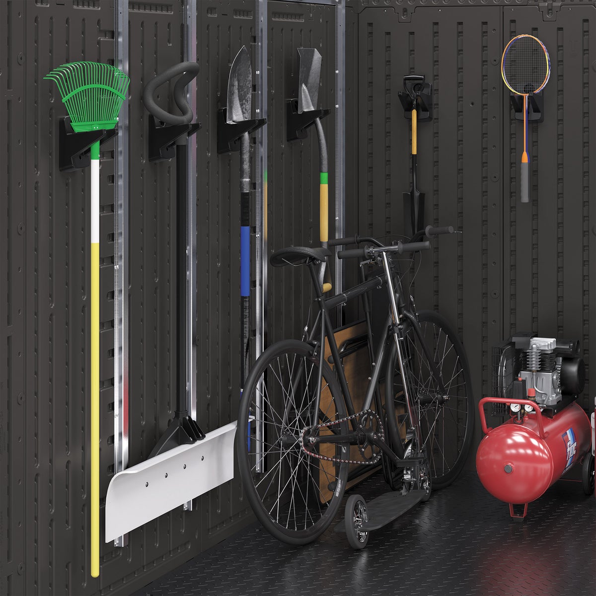 - Includes Storage Basket, (2) 2ft. Storage Shelf, & (6) Single Tool Hook Hanger
