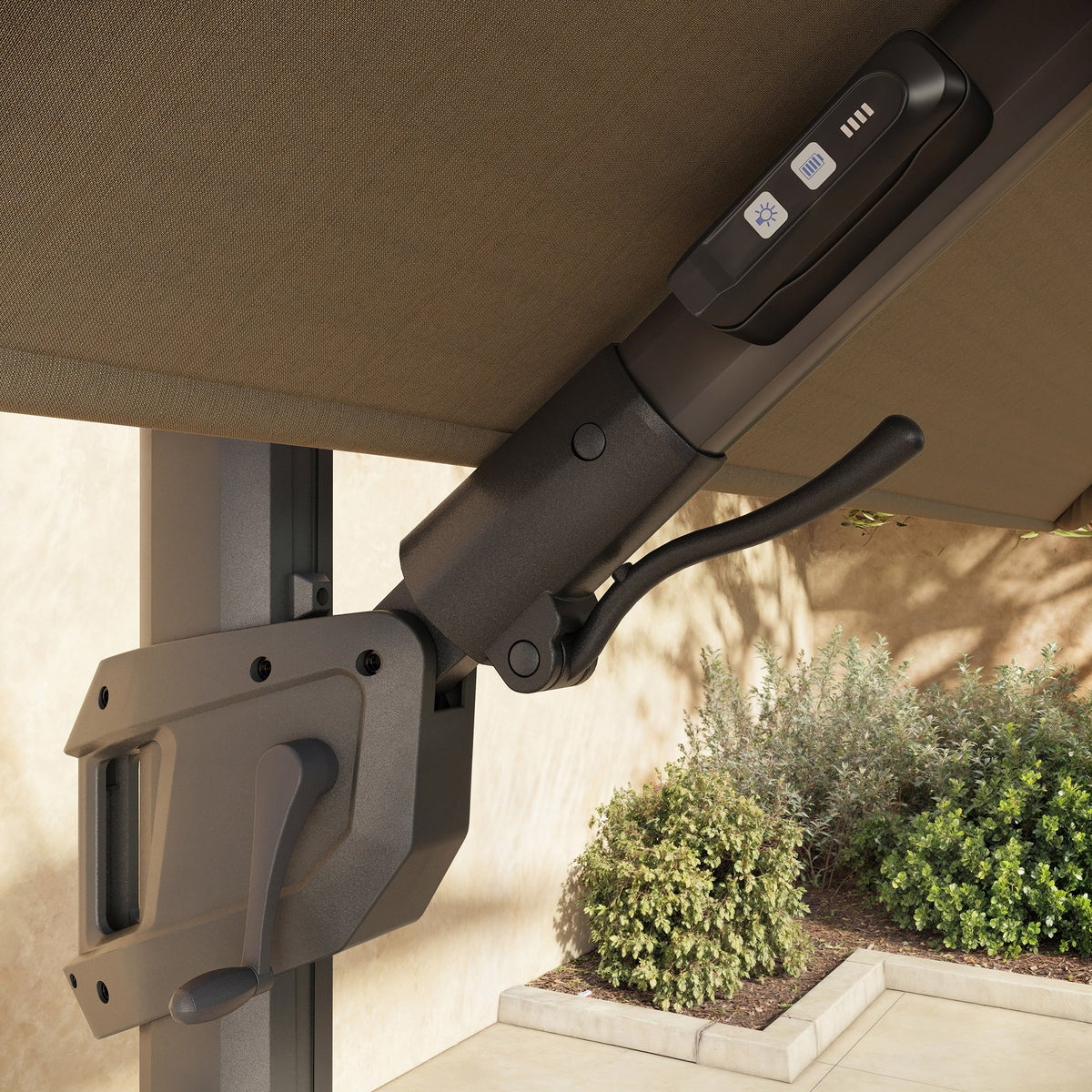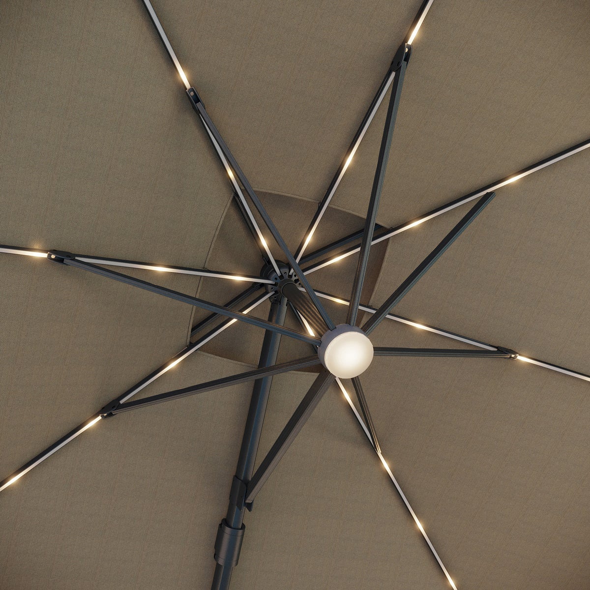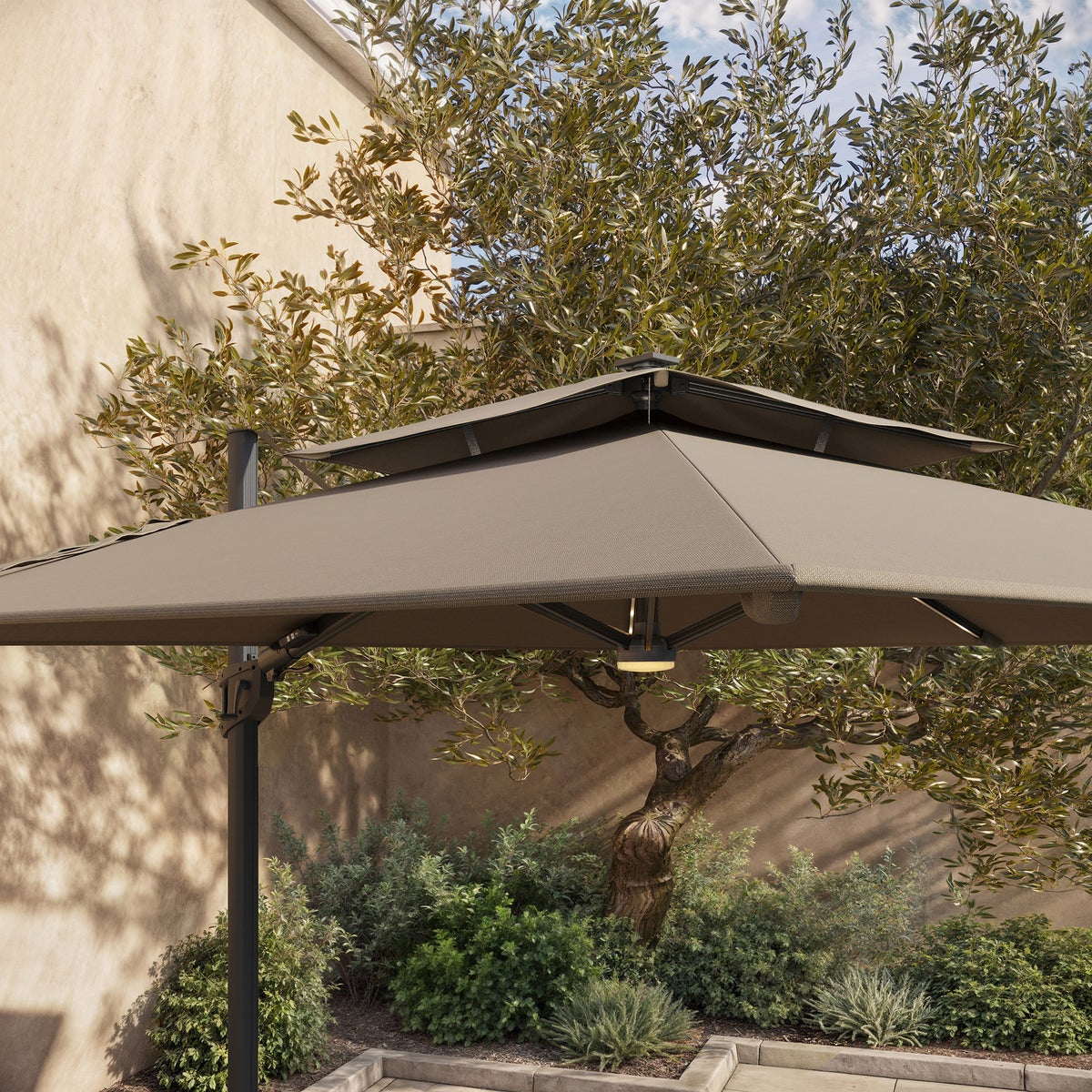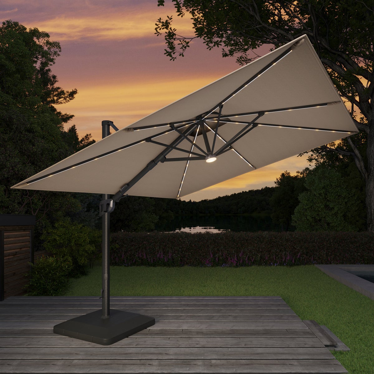 - Seasons Sentry 10' Square 2-Tier Solar LED Aluminum Cantilever Umbrella With Base Two Tier Canopy Allows for Enhanced Wind Resistance and Improved Air Circulation