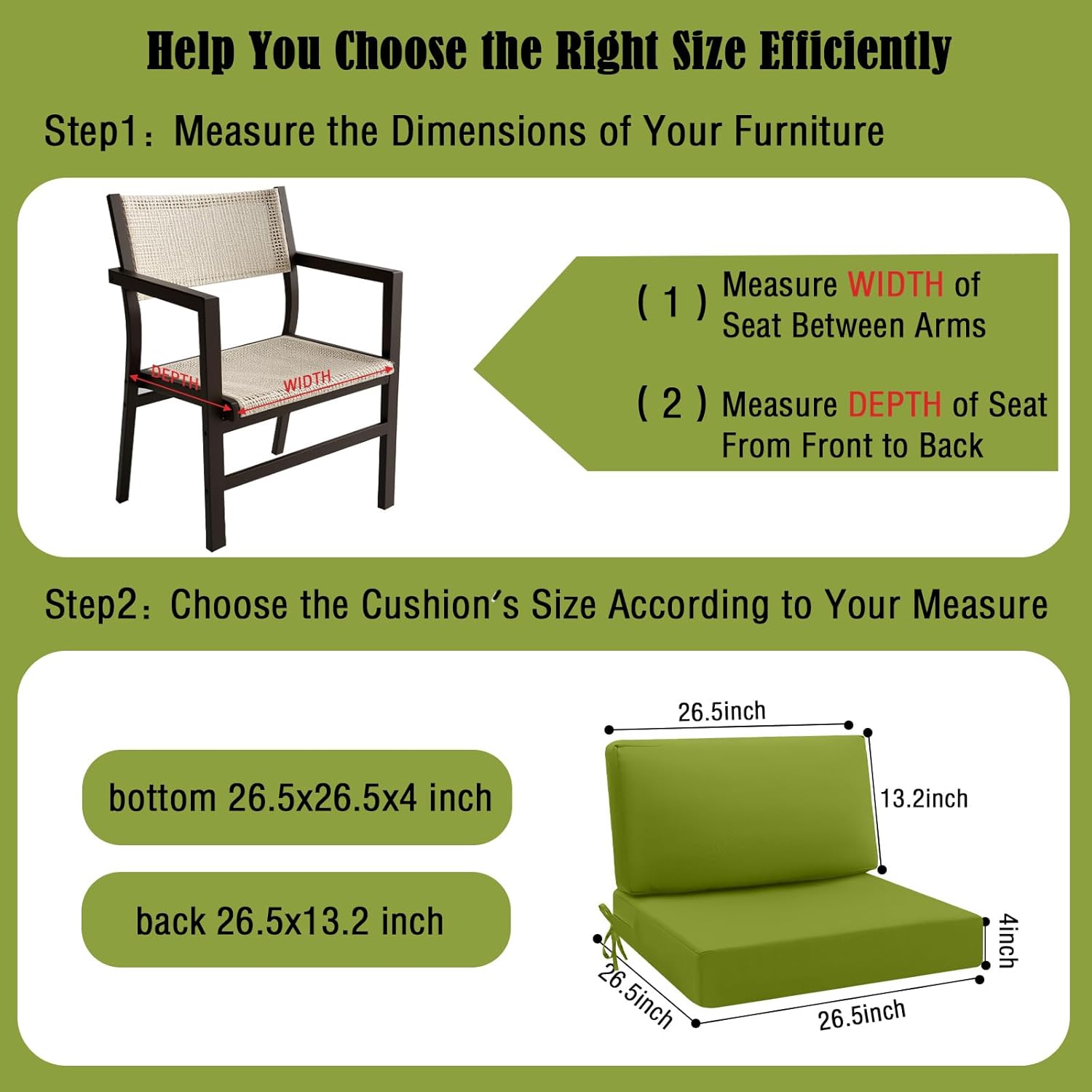 - Size Selection: 2 piece set include 1 back pillow and 1 seat bottom. Please measure the size of your furniture before purchase to ensure the cushions fit properly. Our outdoor cushions are available in different sizes, suitable for sofas and couchs