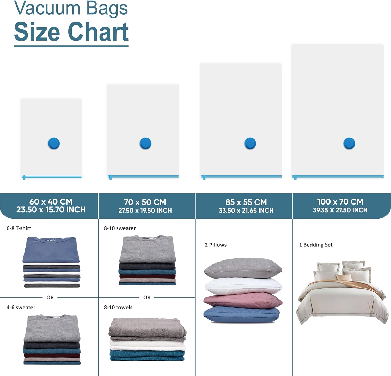- 22 combo includes: 3 jumbo bags (39.4 x 27.5 in) fitting 1 bedding set; 3 large bags (33.5 x 21.7 in) fitting 2 pillows; 8 medium bags (27.5 x19.5 in) fitting 8-10 clothes/towels; 8 small bags (23.5 x 15.7in) fitting 6-8 T-shirts or 4-6 sweaters and 1 portable eletric air pump.