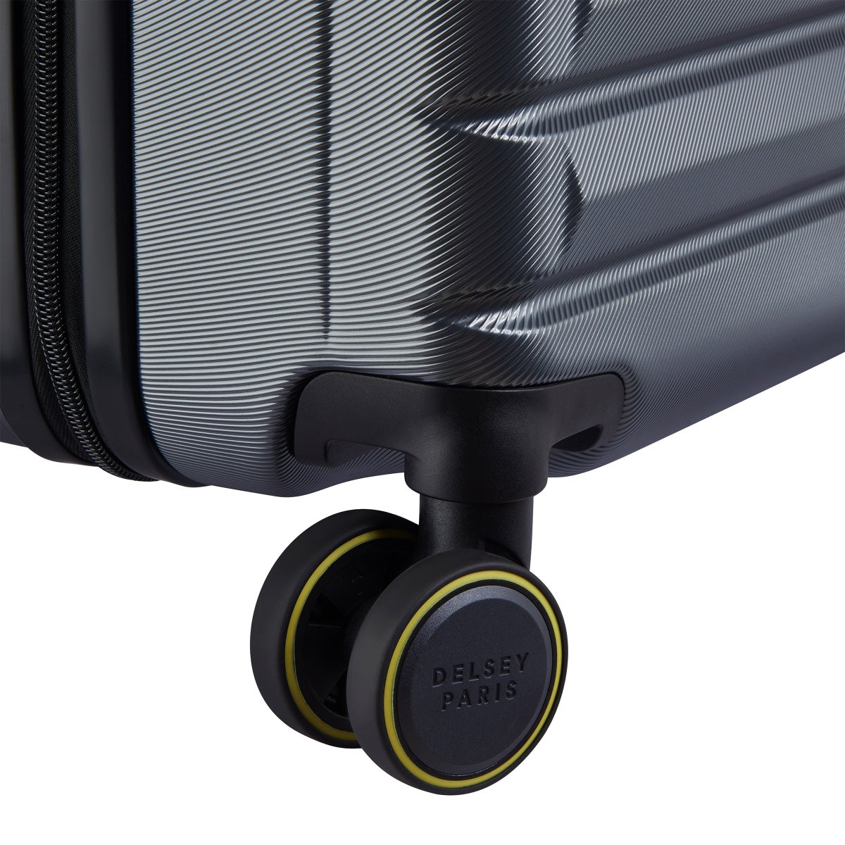 - Delsey Paris 2-piece Hardside Luggage Set, Dark Gray, Durable, Lightweight, Scratch-resistant 100% Polycarbonate Shell, Shock-absorbent Wheels Create Extremely Smooth and Quiet Travel, Interior Includes Multiple Organizational Pockets, Shoe Pockets, and Tie-down Straps, TSA-accepted 3-digit Combination Lock and Expandability (Large Spinner Only), Removable and Washable Lining to Keep Luggage Fresh,