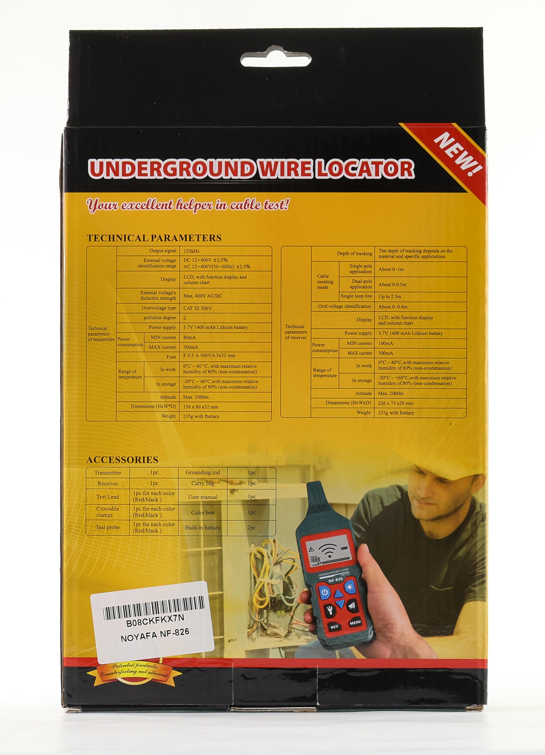 - Underground Wire Locator: Effortlessly locate buried cables and pipelines with NOYAFA NF-826 Underground Wire Locator. Wire tracer range-Up to 3-4 feet deep and 2000 feet in length.This portable instrument includes a transmitter, receiver, anaccessories, and uses digital circuit technology to ensure stable and reliable electrical performance. Save time and avoid damage to walls or ground by diagnosing fault locations without digging up the entire cable path.