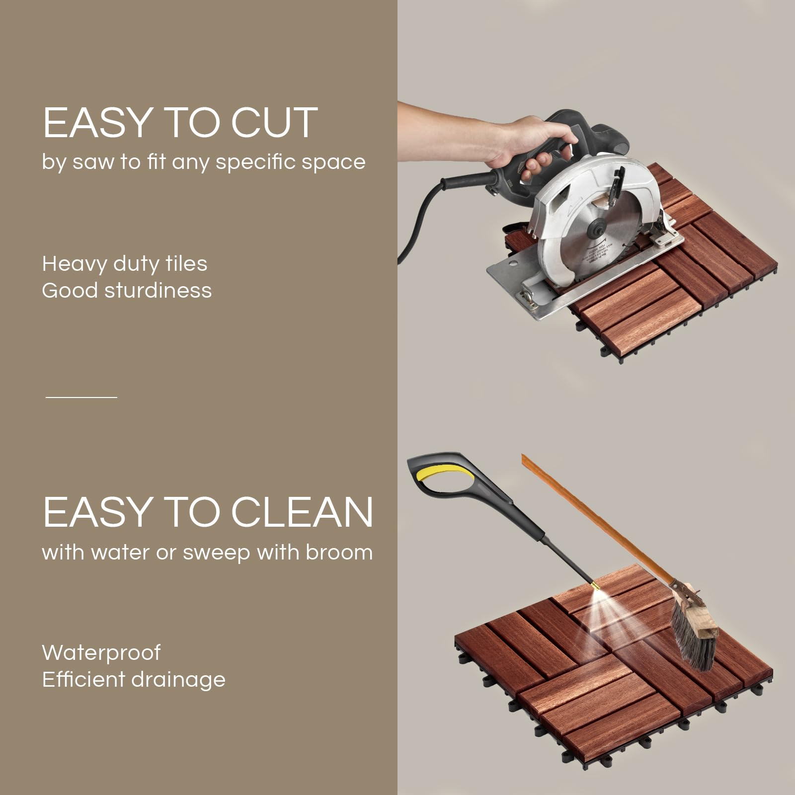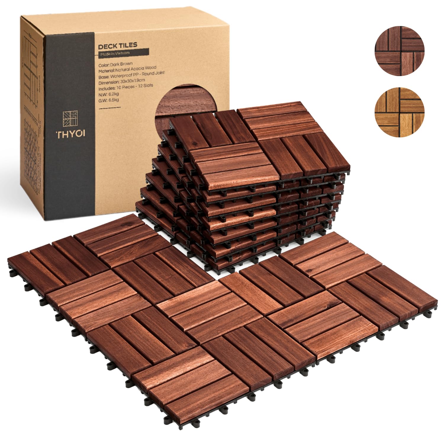 - πππππππ & πππππππ ππππππ πͺπππ: THYOI interlocking deck tiles are made from 100% natural acacia wood and PPC base, which are super sturdy and water-proof to endure outdoor conditions. Under top-notch craftmanship, these patio tiles boast impressive smooth on the surface, firmness when step on and premium aesthetic look. There are 5 colors available and more to come for you to get the most matching one with indoor or outdoor design.
