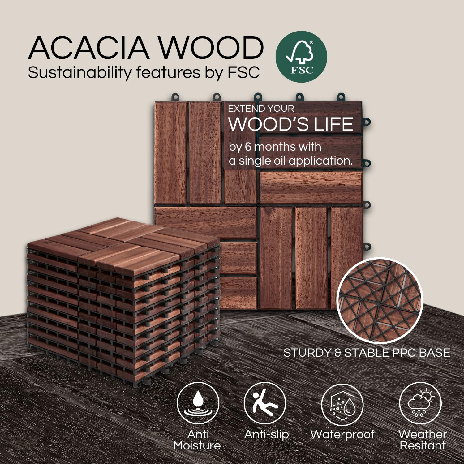 Set 10 Premium Deck Tiles, Interlocking Deck Tile, Wooden Patio Flooring Outdoor Waterproof, Acacia Wood Decking All Weather for Balcony Indoor and Outdoor Use (Dark Brown, Round Joints)