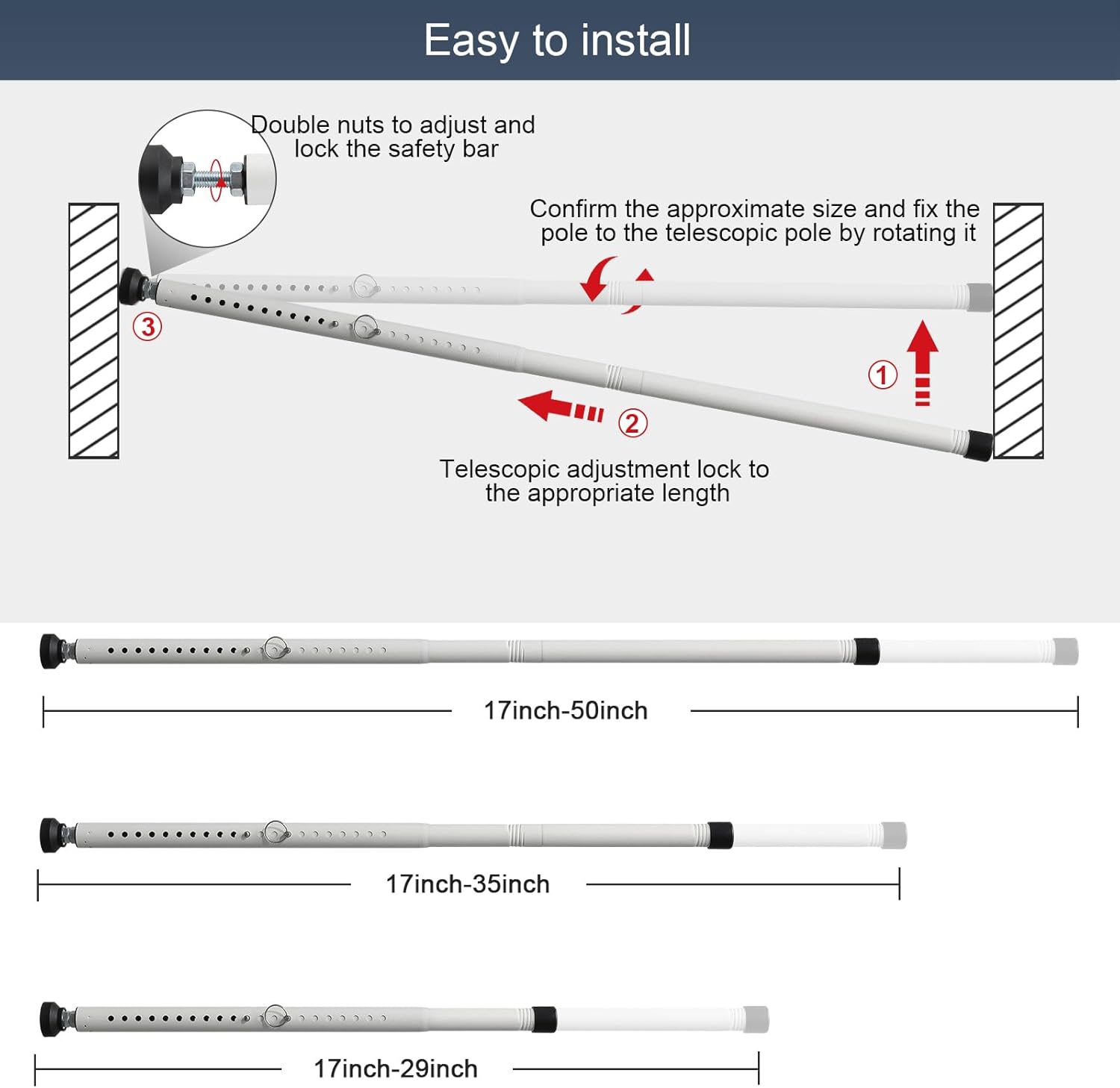 - Easy to Install: Our top window pole can be easily installed in only 3 steps. After selecting the approximate size of the pole, adjust the spring clip to the appropriate size, and fine tune the size of the double nuts on the anti slip base. You can easily install it in place in 1 to 2 minutes!