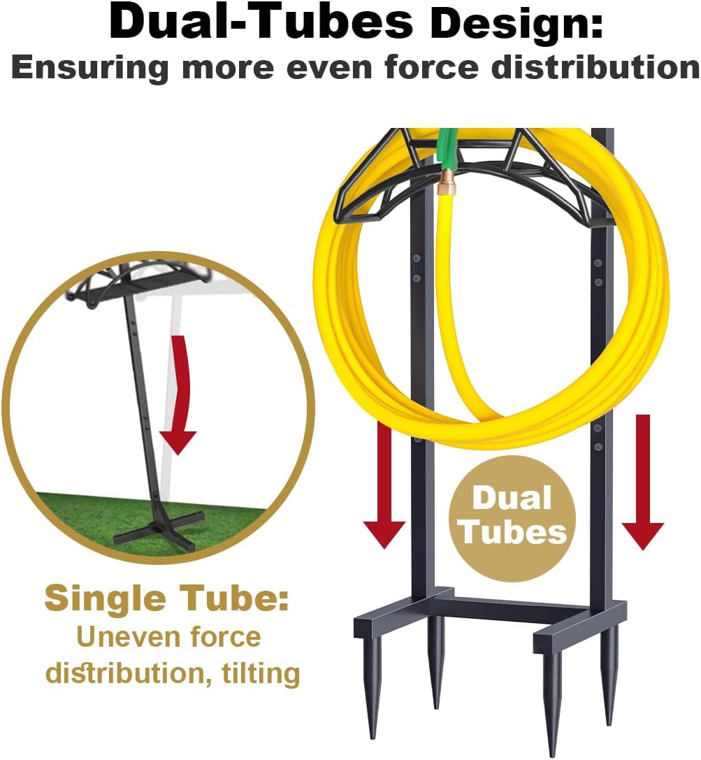 - Stable Dual Tubes: More durable and stable rectangle structure, with more even force distribution, less likely to flip over. Garden hose reel stand is engineered from premium-quality metal that excel in strength and resilience, holds up to 150-FT hose (hose NOT included). Heavy duty powder coated finish designed to withstand various environmental conditions, including exposure to sunlight or rain, the hose holder remains rustproof.