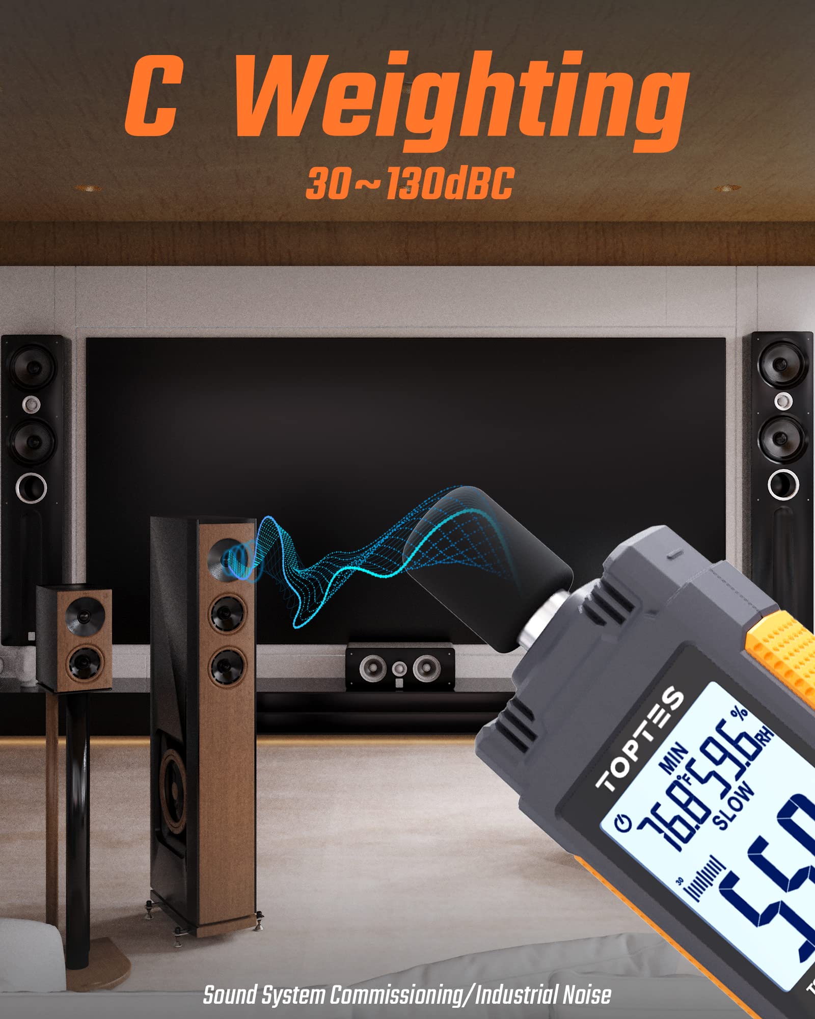 - Decibel Meter with A/C Weighting: TopTes TS-501B decibel meter uses a precise condenser microphone to capture sound. It’s equipped with A-weighting and C-weighting facilities that measure noise levels from 30 to 130 dB with an accuracy of 1.5 dB, Frequency from 30 to 8000Hz. Perfect for monitoring noise levels in communities, home theaters, audio systems, automobiles, workshops, schools, offices, factories