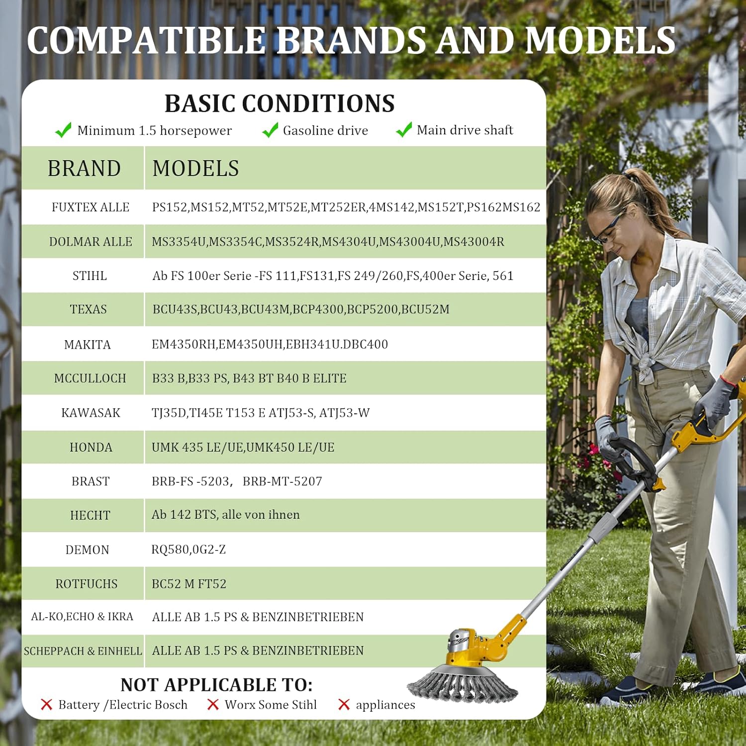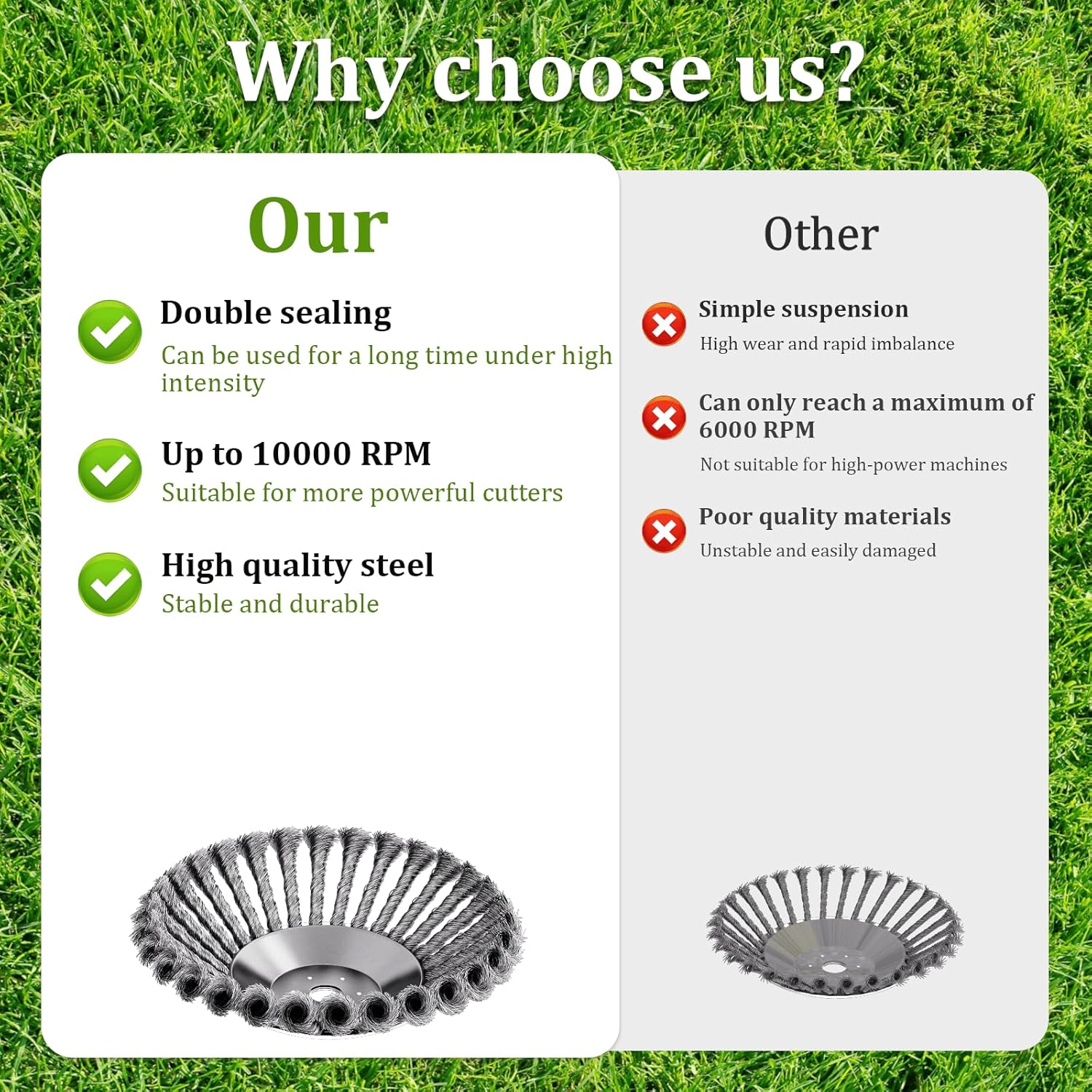 - Safety and Sturdy Material: The unbreakable wired weed brush trimmer head is made of high quality abrasion-resistant steel wire brushes,with double-layered,heat-resistant stainless steel disks make the wire brush blades flexible and stable.Even when it hits rocks, tree stumps or concrete, the weed eater head still works and has ten times longer life expectancy than other trimmers.