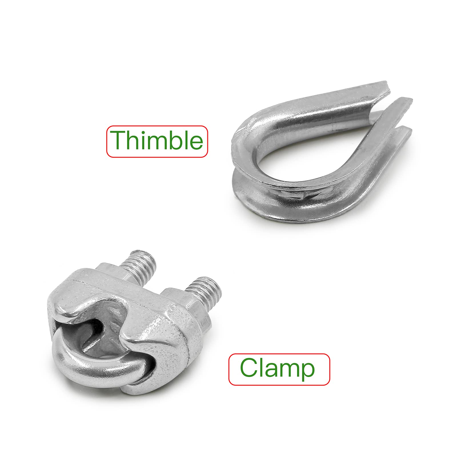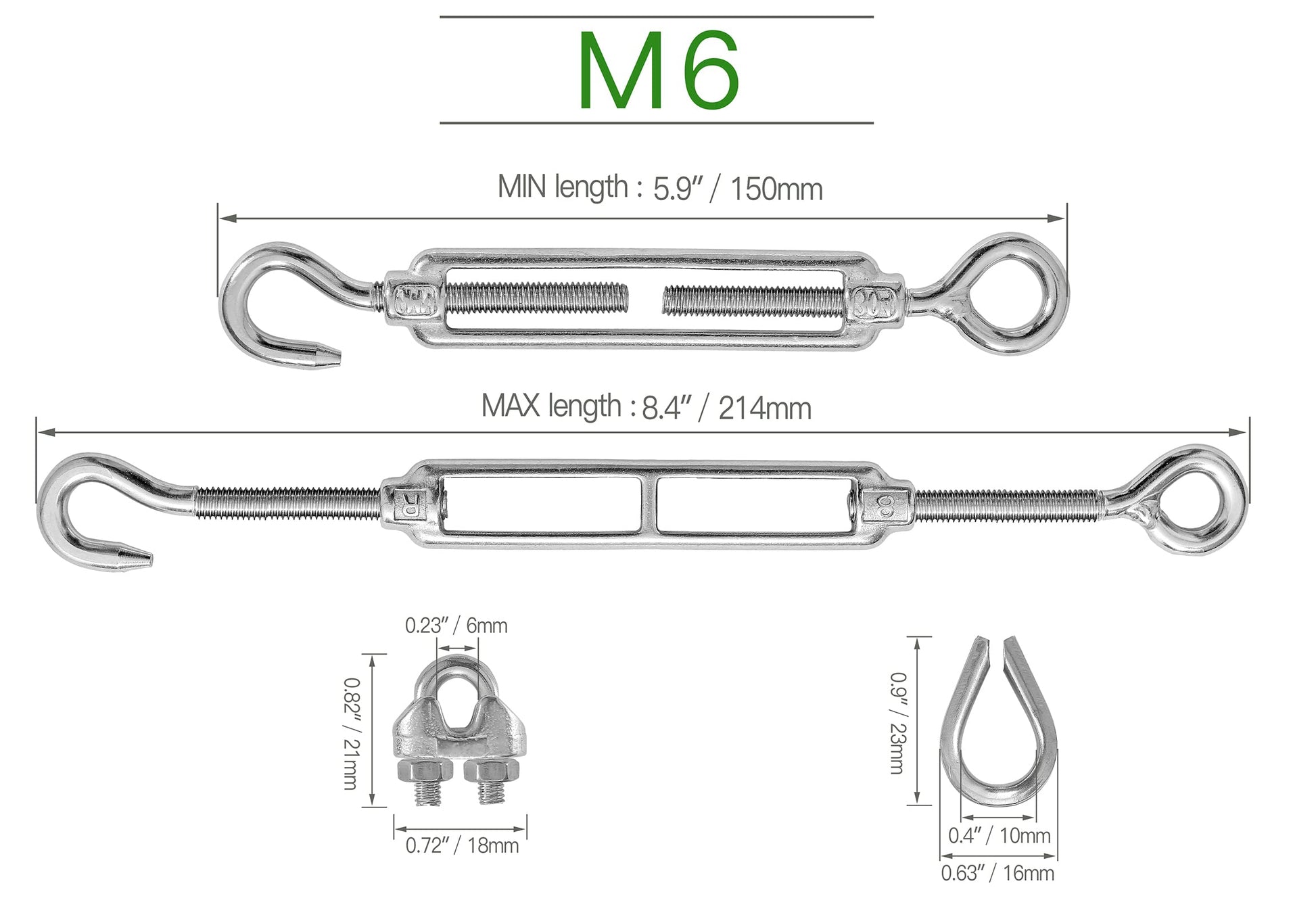 - 【Package Includes】: 4PCS x M6 Hook & Eye Turnbuckle, 8PCS x M3 Stainless Steel Thimble, 16PCS x M3 Wire Rope Clip Clamp. NOTE: For a safe connection, pleased make sure to use the right number of clamps and the bolts must be tightened.