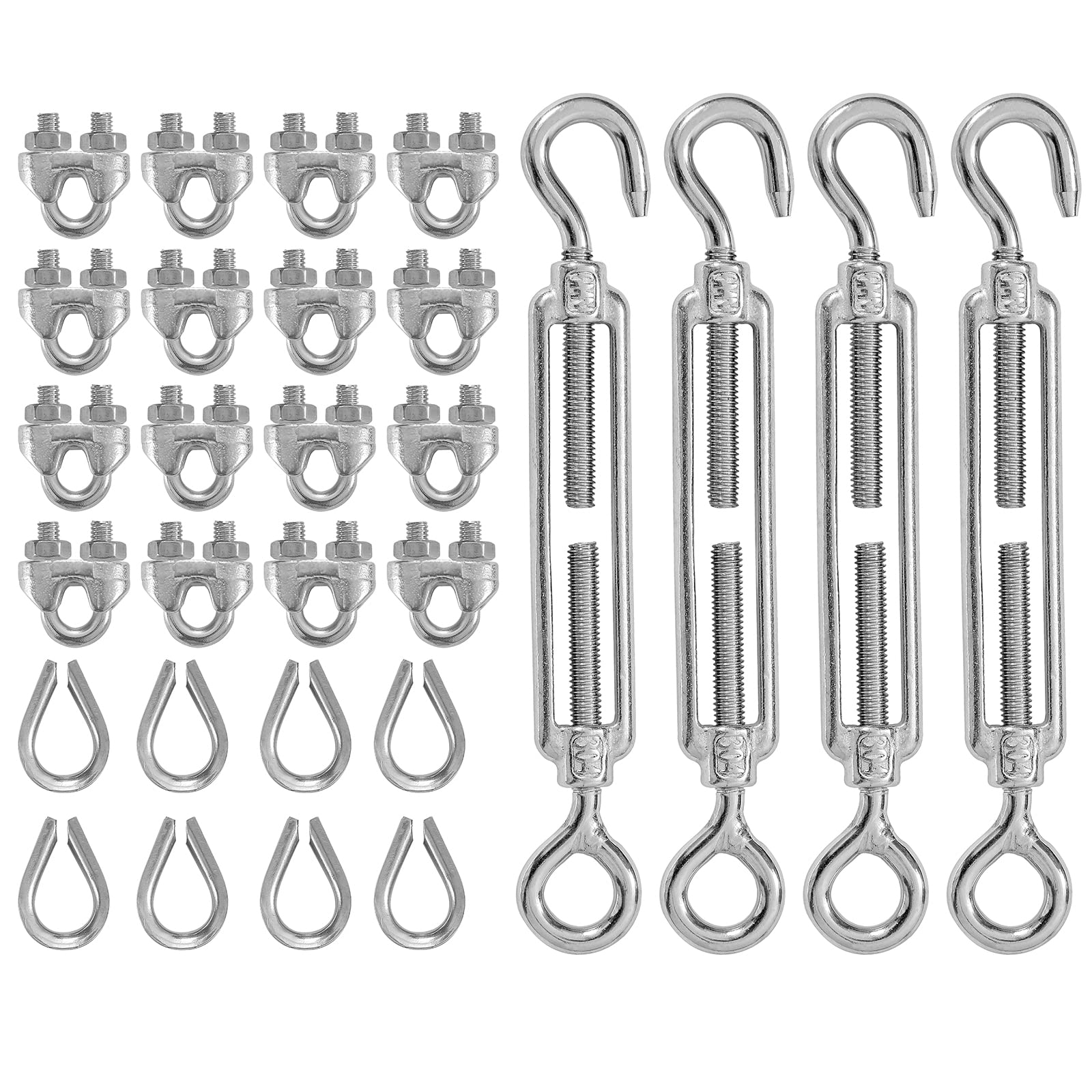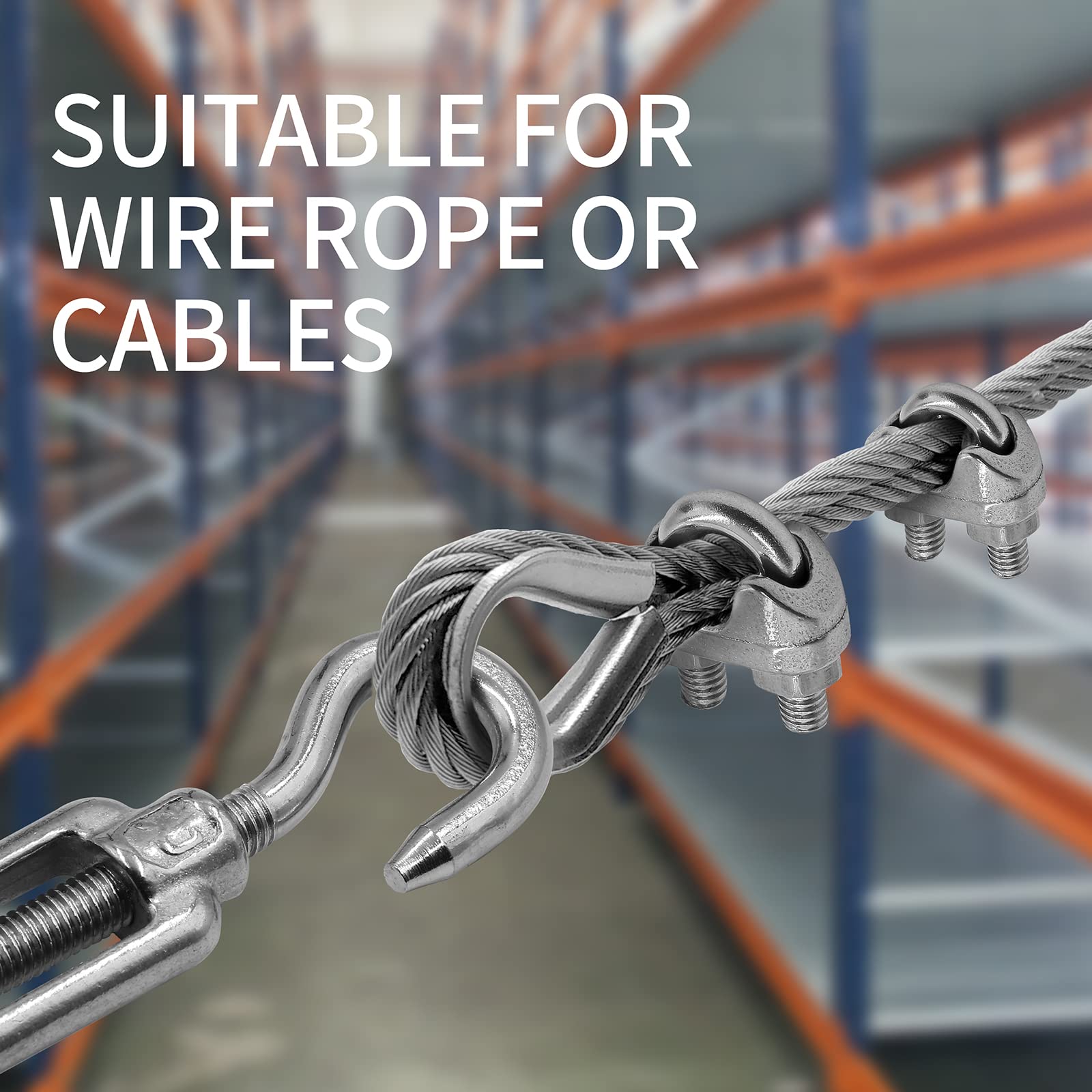 - 【Heavy Duty Turnbuckle Kit】: The hook & eye turnbuckle can be used for tightening among steel wire rope and chain; The stainless steel thimble provides excellent protection against surface abrasion of wire ropes, tight loop in coated or bare wire ropes; The wire rope clips are applied to fix the loose end of the loop back to the wire rope. This is a perfect combination to meet your needs