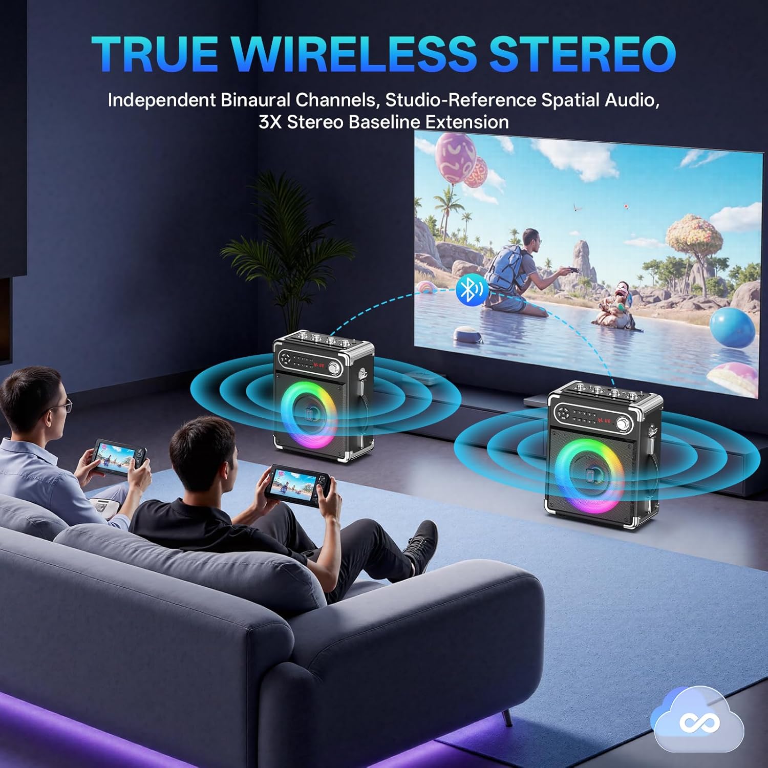 - 【TWS Function for Dual-Speaker Wireless Stereo Pairing 】- Connect two speakers via TWS mode to build a powerful, room-filling PA system. Experience true left and right channel separation with an expanded stereo soundstage for studio-like audio. Perfect for outdoor parties or home concerts, it delivers immersive surround sound and twice the volume for an unforgettable experience.