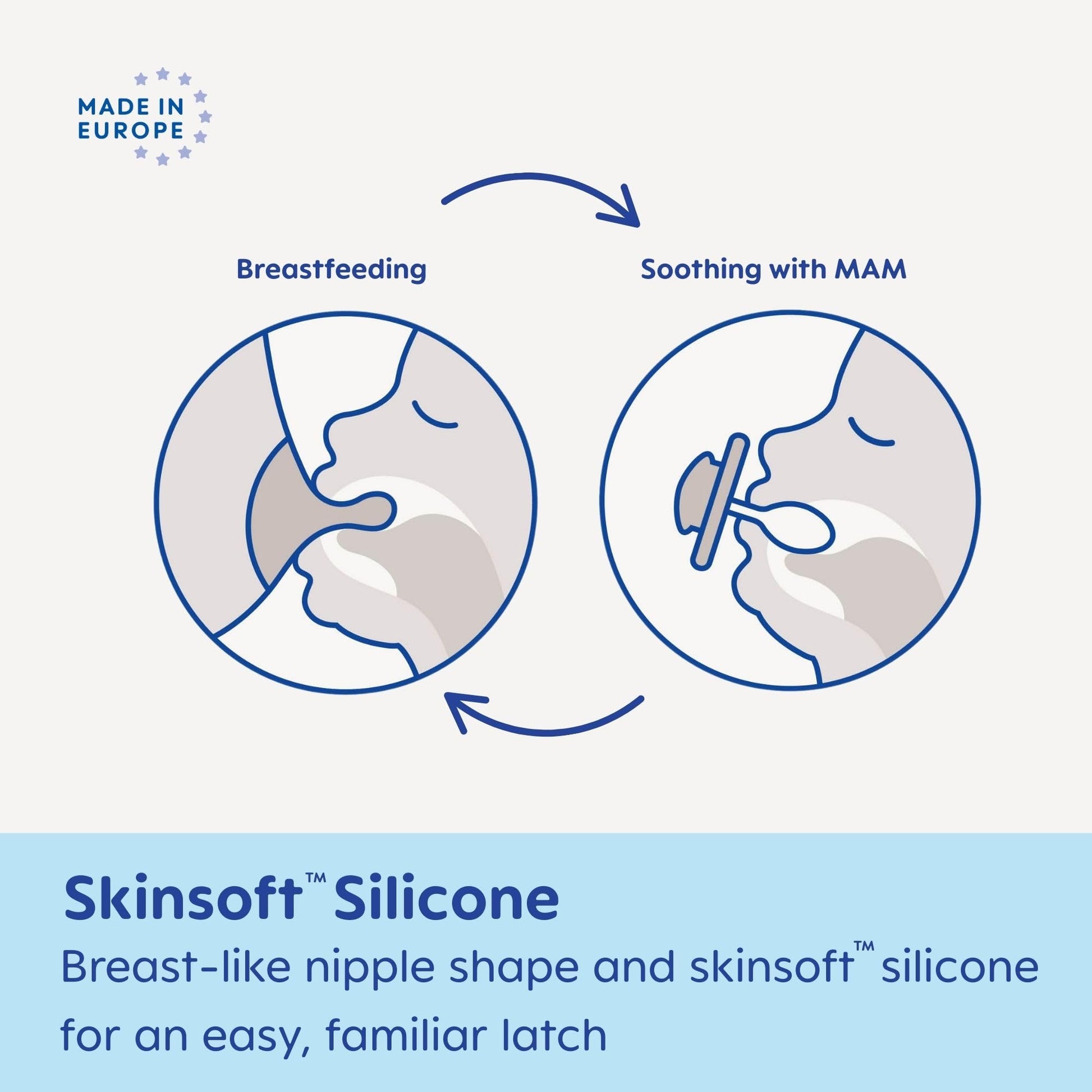 - SILICONE NIPPLE: The BPA-free silicone boy and girl pacifier has the signature MAM design, with silky SkinSoft material and a symmetrical shape that's ideal for a healthy oral development.