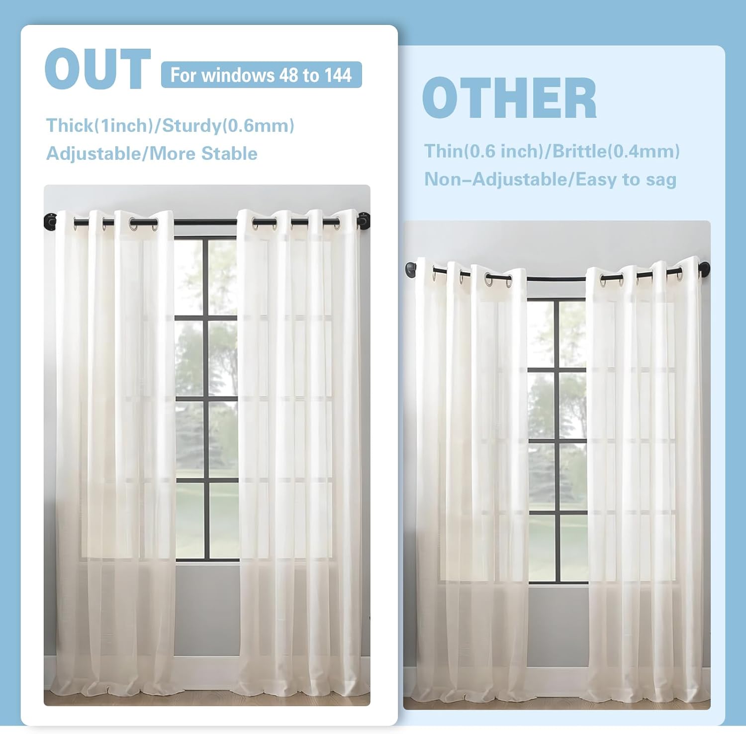 - 100% METAL ADJUSTABLE LENGTH: 0.6mm thickness 1 Inch diameter curtain rod adjusts from 16 to 144 inches or 150 inches max. You can adjust the length by One Telescopic Pipe to fit different size windows. Comes with 10 rods that need to be screwed together, not 3 poles