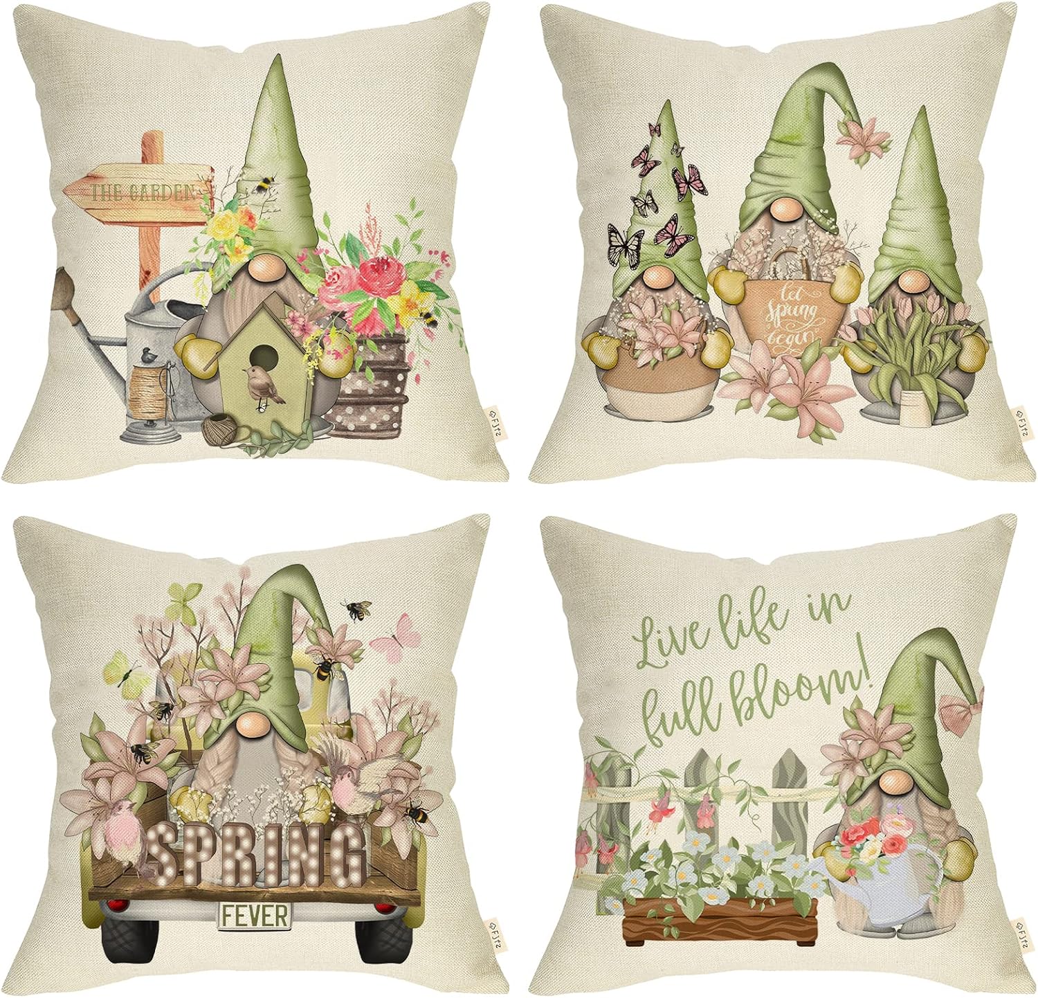 Spring Fever Gardening Gnome Truck Decorative Throw Pillow Cover 20x20 Set of 4, Lily Flowers Bee Bird House Watering Can Home Decors, Butterfly Green Birdhouse Rustic Decoration Floral Farmhouse