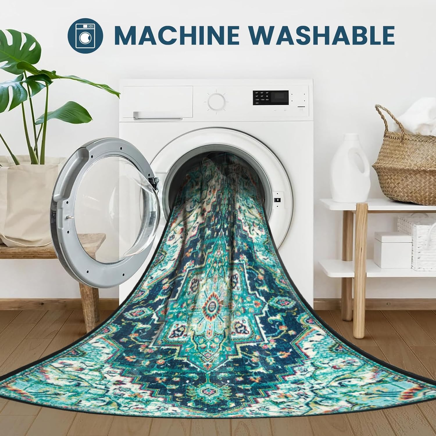 Area Rug 6x9 Washable Living Room Rug, Vintage Soft Boho Non-Slip/Non-Shedding Print Floor Carpet for Dining Room, Bedroom-Green - Retail $90