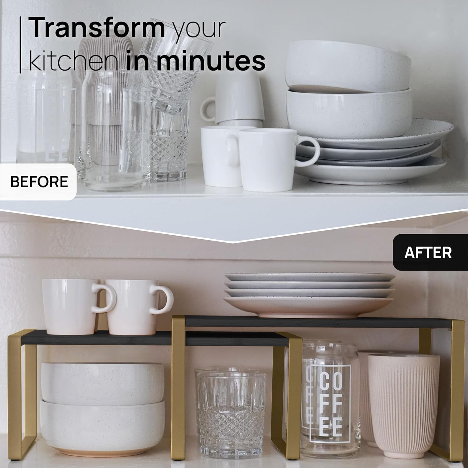- ๐๐๐๐๐ ๐๐ ๐๐๐๐ - Made with a sturdy Metal frame and Engineered Wood, Ibyx kitchen shelf organizer rack set is sturdy, durable while being eco-friendly, water-resistant & stylish. Bamboo adds a touch of elegance and fine workmanship, smooth surface, long-lasting paint make these cabinet shelves a complete package. Say goodbye to messy cabinets and hello to a neat and tidy kitchen!