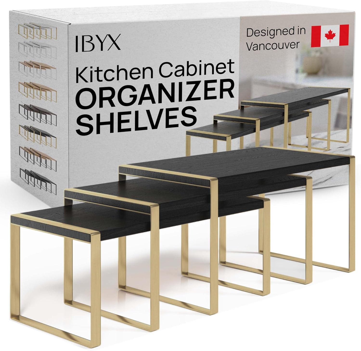 Ibyx Premium Kitchen Cabinet Organizer Shelf - Set of 3 Kitchen Counter Shelves - Stackable Shelf Racks for Cabinets - Metal Frame & Engineered Wood (Black Wood, Gold Frame)