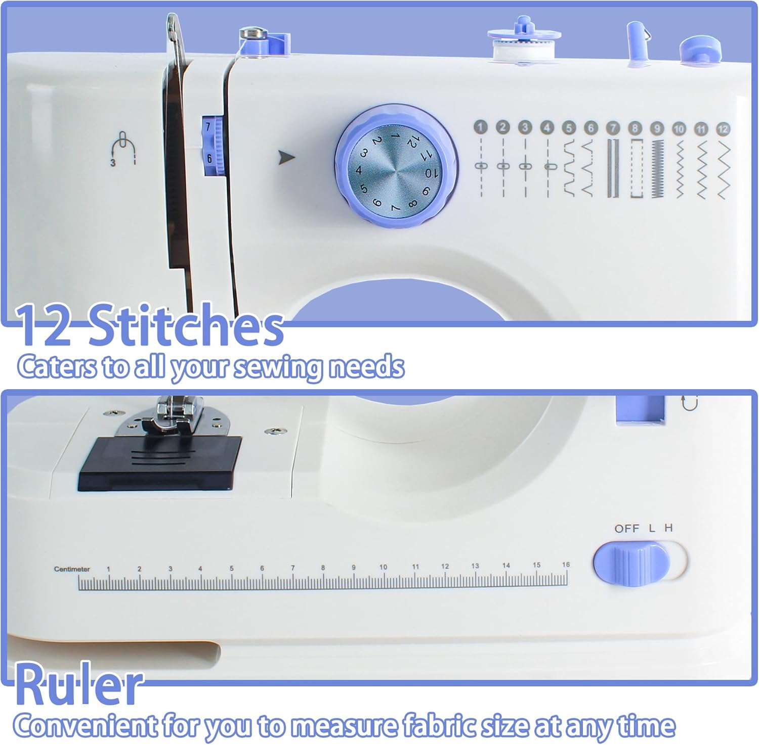 Sewing Machine for Beginners with 20 Pcs Fabric and 32 Pcs Sewing Threads Kit,Portable Sewing Machine with 12 Built-in Stitches,2 Speed(High-Low Speeds) - White Blue