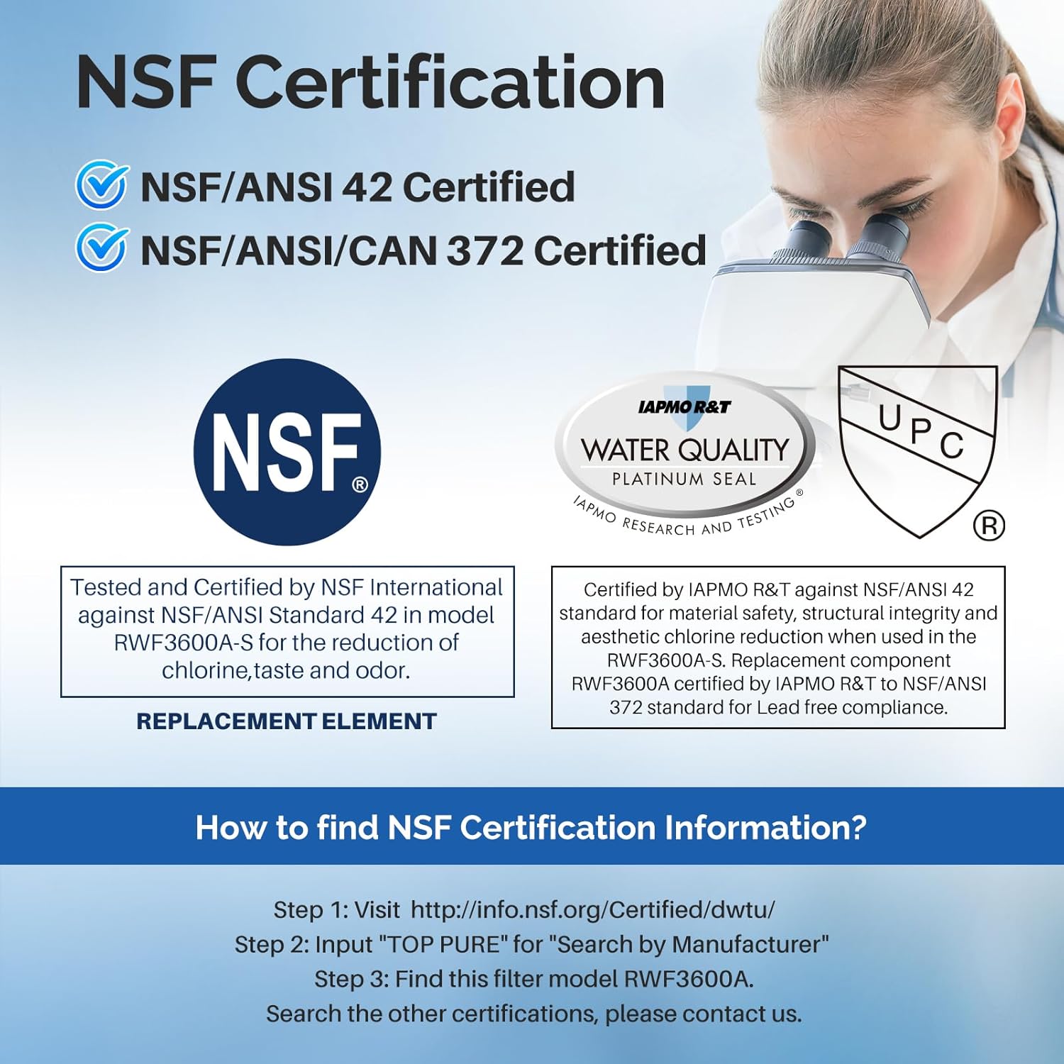 - AUTHORITATIVE CERTIFICATIONS - ICEPURE RWF3600A replacement for GE RPWF refrigerator water filter bears major Authoritative Certifications on markets, NSF/ANSI 42 & NSF/ANSI/CAN 372, Lead-Free, European Food Grade Regulations EC-1935/2016, ROHS, REACH, BPA-Free, TUV and Australian Water Mark.