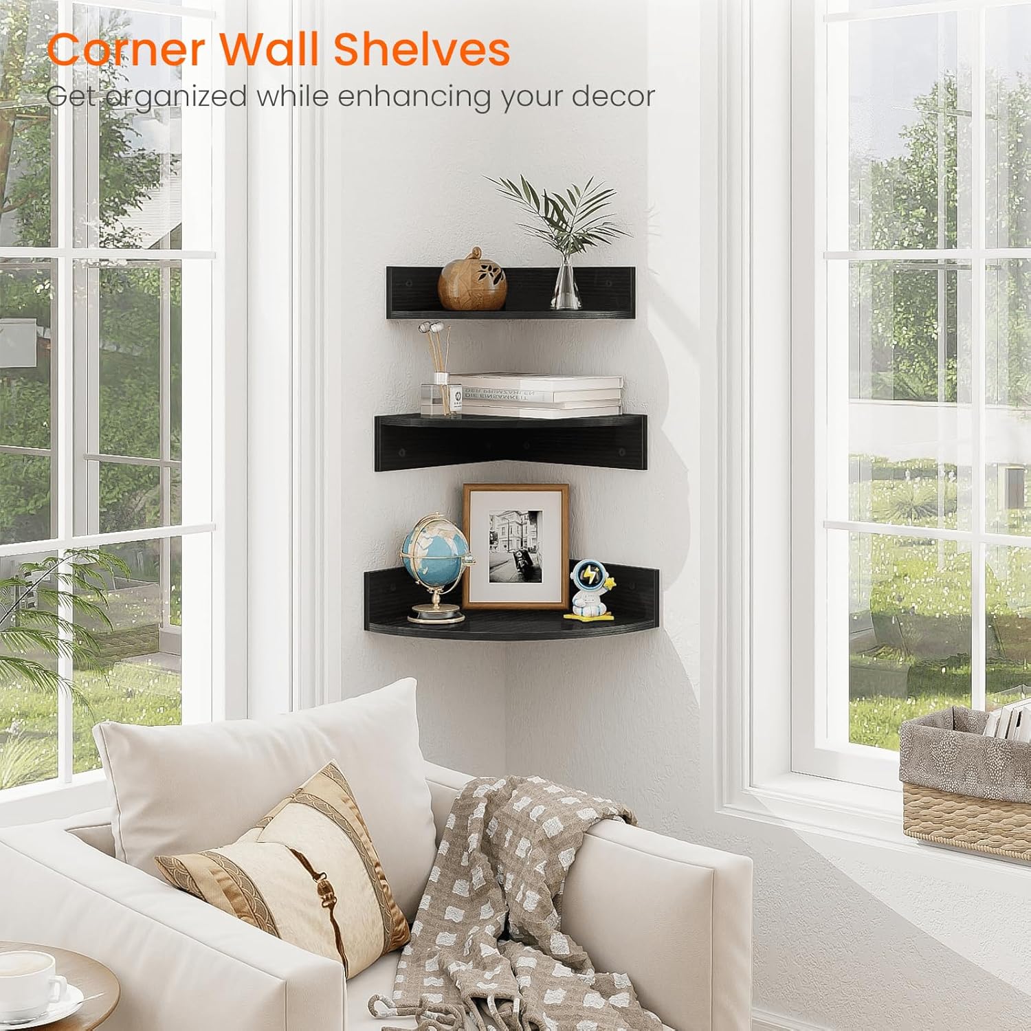 - STYLISH DESIGN FOR HOME DECOR: Wall mounted corner shelf mixes storage with style, with curved lines and sleek edge, black oak finish, create a classic and clean look, match with any of your decor and perfect for organizing everything, enhance vintage aesthetic for your space